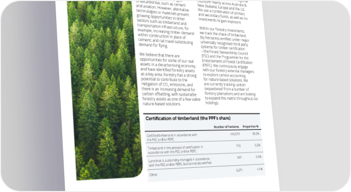 34 www.ppf.co.uk Responsible Investment Report 2019/20 35 Managing climate change risks and opportunities – continued A p Climate-related disclosure High-level findings p Identifying opportunities r Our exposure to o Whilst sectors such as renewable sustainable forestry Transparency and regular reporting are essential aspects The initial results of the assessments carried out on ach energy are clearly likely to benefit We have approximately £600 million of responsible investing and we are committed to our listed global equity and credit portfolios are shown from a transitioning economy, invested in timberland, with regional disclosing to our internal and external stakeholders. In below. Both portfolios are less carbon intensive than their we also recognise that some exposure mainly across Australia & relation to climate disclosure, we recognise that there benchmarks in terms of their exposure to operational sectors face larger challenges New Zealand, Europe and the US. is no single commonly agreed measurement of climate- carbon emissions. Scenario analysis indicates that some to decarbonise, such as cement We use a combination of primary related risks and opportunities, and we will continue companies within both portfolios could be associated and aviation. However, alternative and secondary funds, as well as co- to examine the most appropriate metrics to track our with potential transition risks due to their exposure to technologies or materials present investments to gain exposure. progress. We have expanded our ESG data coverage high carbon-intensive activities (e.g. in utilities, energy growing opportunities in other to provide us with a range of metrics at a portfolio and materials sectors). We have also started measuring sectors such as timberland and and issuer level – including scope 1, 2 and 3 carbon physical risk exposure for the listed global equity and Within our forestry investments, E transportation infrastructure, for we track the share of timberland emissions; climate value-at-risk measures; extractive credit portfolios, where coastal flooding is likely to be the xe example, increasing timber demand c fossil fuel revenues and reserves data; and physical risk most significant hazard. These findings have been useful u (by hectares) certified under major t within construction in place of datasets on various climate-induced events. in informing our conversations with our active external io cement; and rail travel substituting universally recognised third-party managers, and guiding our involvement in the various n demand for flying. systems for timber certification investor initiatives highlighted already. – the Forest Stewardship Council We believe that there are (FSC) and the Programme for the opportunities for some of our real Endorsement of Forest Certification Scope 1 + Scope 2 carbon footprints of our Transition Risks within Global assets in a decarbonising economy, (PEFC). We continuously engage and have identified forestry assets with our forestry external managers publicly listed Global Equities and Global Equities and Global Credit portfolios: as a key area. Forestry has a strong to explore carbon accounting Credit portfolios (as at 31 Dec 2019): potential to contribute to the for nature-based solutions. We Equity portfolio: Global Credit portfolio: Equity portfolio: Global Credit portfolio: are currently tracking carbon L mitigation of CO emissions, and o 2 sequestered from a number of • Weighted Average • Weighted Average • Sectors most at risk: • Sectors most o there is an increasing demand for k forestry plantations and are looking in carbon offsetting, with sustainable Carbon Intensity* Carbon Intensity* Utilities, Energy, at risk: Utilities, g f to expand this metric throughout our = 290 tCO e/USDm = 250 tCO e/USDm Transportation, Transportation, o forestry assets as one of a few viable 2 2 r holdings. w nature-based solutions. revenue revenue Materials Energy, Materials ar • Over 30% lower than • Over 20% lower than • Exposure to • Exposure to d the respective Global the respective Global extractives by MV = extractives by MV = Certification of timberland (the PPF’s share) Equity benchmark Credit benchmark 4% lower than Equity 36% lower than Credit Number of hectares Proportion % benchmark benchmark • Portfolio warming • Portfolio warming Certified timberland in accordance with 440,579 98.2% potential = 11% lower potential = 5% lower the FSC and/or PEFC than Equity benchmark than Credit benchmark Timberland in the process of certification in 742 0.2% accordance with the FSC and/or PEFC Land that is sustainably managed in accordance 997 0.2% Physical Risks most exposed to in Opportunities for Global Equities with the FSC and/or PEFC, but cannot be certified our publicly listed Global Equities and Global Credit portfolios: Other 6,271 1.4% and Global Credit portfolios: Equity portfolio: Global Credit portfolio: Equity portfolio: Global Credit portfolio: Coastal Flooding, Coastal Flooding • Exposure to • Exposure to renewable Extreme Heat • Sectors most at risk: renewable energy- energy generation by • Sectors most at risk: Software & Services, generation by MV MV = 9% lower than Software & Services, Consumer Services, = 55% higher than benchmark Autos, Transport, Transportation, benchmark Utilities, Banks, Utilities, Technology Telecoms, Technology, Energy, Materials * We have used the Weighted Average Carbon Intensity (WACI) of Scope 1 + Scope 2 tonnes of CO equivalent emissions per million USD of 2 revenues metric, as currently recommended by the TCFD (holdings as at 31/12/2019). Certain information ©2020 MSCI ESG Research LLC. Reproduced by permission; no further distribution.