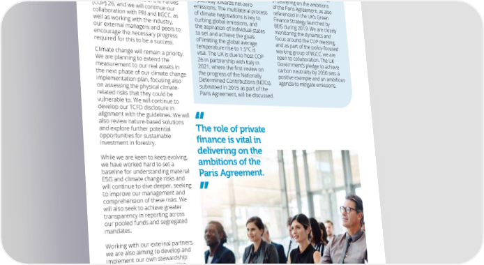 40 www.ppf.co.uk Responsible Investment Report 2019/20 41 Continuing to drive RI forward A p Further development and Considering the p r UNFCCC COP 26 in the UK o continuation of RI capabilities, ‘new normal’ ach collaboration and active We need to see real world The role of private finance making ownership economy reductions of global finance flows consistent is vital In the year ahead, a critical carbon emissions and pursue in delivering on the ambitions In early 2020 the world was faced development is the lead-up to the a pathway towards net-zero of the Paris Agreement, as also with the unprecedented challenge UNFCCC’s Conference of the Parties emissions. The multilateral process referenced in the UK’s Green of the pandemic, caused by (COP) 26, and we will continue our of climate negotiations is key to Finance Strategy launched by coronavirus, leading to widespread collaboration with PRI and IIGCC, as curbing global emissions, and BEIS during 2019. We are closely disruption of economic and social well as working with the industry, the aspiration of individual states monitoring the dynamics and activity. We appreciate the gravity our external managers and peers to to set and achieve the goals focus around the COP meeting, of the situation facing the global E x encourage the necessary progress e of limiting the global average and as part of the policy-focused economy and circumstances faced c required for this to be a success. u t temperature rise to 1.5°C is working group of IIGCC, we are by many companies, and recognise ion Climate change will remain a priority. vital. The UK is due to host COP open to collaboration. The UK the critical role of good and stable We are planning to extend the 26 in partnership with Italy in Government’s pledge to achieve leadership – by both companies and measurement to our real assets in 2021, where the first review on carbon neutrality by 2050 sets a governments – in the management the next phase of our climate change the progress of the Nationally positive example and an ambitious of the immediate crisis and the type implementation plan, focusing also Determined Contributions (NDCs), agenda to mitigate emissions. of recovery that arises, while still on assessing the physical climate- submitted in 2015 as part of the considering the ongoing climate related risks that they could be Paris Agreement, will be discussed. crisis. Consequently, in the current vulnerable to. We will continue to AGM season, we have been voting develop our TCFD disclosure in for some ballots by exception if they are deemed important to ensure L alignment with the guidelines. We will o ongoing stability within a company’s o also review nature-based solutions k i management. n and explore further potential The role of private g f opportunities for sustainable o r investment in forestry. finance is vital in war delivering on the d While we are keen to keep evolving, ambitions of the Case study we have worked hard to set a baseline for understanding material Paris Agreement. Social infrastructure ESG and climate change risks and will continue to dive deeper, seeking to improve our management and One of our external government’s plan to add comprehension of these risks. We infrastructure managers beds to the healthcare will also seek to achieve greater recently opened the new system to tackle the transparency in reporting across Felix Bulnes Hospital in coronavirus pandemic. our pooled funds and segregated Santiago, Chile. This new mandates. state-of-the-art hospital will The hospital is modern Working with our external partners, provide health and sanitary and innovative, using we are also aiming to develop and services, emergency environmentally- implement our own stewardship inpatient, outpatient, adult, efficient systems and policy, including bespoke voting paediatric and maternal materials, energy-efficient policies for certain key themes. care to a population of architecture with the most 1.2 million people in one stringent anti-seismic of the poorest areas of technology, and contributes Chile. President Piñera to the infrastructure announced that the external manager’s global opening of the hospital strategy to deliver resilient will directly contribute infrastructure and develop up to 30 per cent of the sustainable cities.