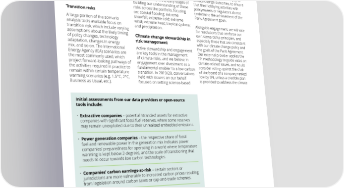 32 www.ppf.co.uk Responsible Investment Report 2019/20 33 Managing climate change risks and opportunities – continued A p Scenario analysis and risk Physical risks targets, conducting climate- risks and opportunities of the low- actions from management such as p r o management Physical risks can manifest in the risk stress tests, and increased carbon transition. They wrote to strategic alignment with the goals ach We have started to consider methods short, medium and long term, and disclosures which included TCFD 63 companies were 63 companies to advise them on of the Paris Agreement, or building for evaluating the future resilience of both chronic and acute risks will have reporting. We have also asked some engaged with ahead these guidelines and requested resilience to climate change. In the our portfolios, by reviewing a range different implications across asset companies to link executive pay to further engagement ahead of each calendar year of 2019, across our of different scenarios where climate classes. We are in the early stages of climate change outcomes, to ensure of AGMs on our company’s annual shareholder segregated and pooled equities, issues may be material. building our understanding of these that their lobbying activities with meeting. Through engagement, a few we supported 24 high-profile risks across the portfolio, focusing policymakers or regulators do not TPI-informed voting. companies disclosed further details resolutions at US companies that undermine the achievement of the of their climate change strategies called for better climate change Transition risks on: coastal flooding; extreme Paris Agreement goals. and emissions, leading to improved disclosure, adoption of greenhouse A large portion of the scenario snowfall; extreme cold; extreme scores in TPI analysis. gas emissions reduction targets, wind; extreme heat; tropical cyclone; Alongside engagement, we will vote and reporting on lobbying and E analysis tools available focus on and precipitation. for resolutions that reinforce our As participants in investor political activities. We also voted for xe transition risk, which include varying c u own stewardship principles, and initiatives such as Climate Action shareholder resolutions outside t assumptions about the likely timing io of policy changes, technology Climate change stewardship in especially those that are consistent 100+, we are also constructive of of the US, including a resolution n adaptation, changes in energy risk management with our climate change policy and certain shareholder resolutions on lobbying reporting at a large mix, and so on. The International Active stewardship and engagement the goals of the Paris Agreement. that encourage appropriate diversified mining company, and Energy Agency (IEA) scenarios are are key tools in the management Our external provider applies the improvements in company a resolution calling for strategic the most commonly used, which of climate risks, and we believe in TPI methodology to guide votes on management and the disclosure of alignment to the Paris Agreement project forward-looking pathways of engagement over divestment as a climate-related issues, and would material climate-related financial at a large UK ‘oil major’ – another the activities required in practice to fundamental enabler to a low-carbon consider voting against the chair risks. Some significant shareholder resolution to be supported by the remain within certain temperature transition. In 2019/20, conversations of the board of a company ranked Supported 24 US resolutions resolutions were filed during 2019, company’s management. warming scenarios (e.g. 1.5°C, 2°C, held with issuers on our behalf low by TPI, unless a credible plan related to climate change mostly in the US, which requested is provided to address the climate L Business as Usual, etc.). focused on setting science-based o o k in g f o r Initial assessments from our data providers or open-source In action w ar tools include: For example, our external d • Extractive companies – potential ‘stranded’ assets for extractive provider acts as lead or co- companies with significant fossil fuel reserves, where some reserves lead engager for 27 companies may remain unexploited due to their unrealised embedded emissions. included in Climate Action 100+. We saw encouraging progress from a major oil company in • Power generation companies – the respective share of fossil 2019, where the company’s fuel and renewable power in the generation mix indicates power management also supported companies’ preparedness for operating in a world where temperature the shareholder resolution warming is kept below 2-degrees, and the scale of transitioning that developed by our external needs to occur towards low carbon technologies. provider – calling on the company to set a strategy consistent • Companies’ carbon earnings-at-risk – certain sectors or with the Paris Agreement goals. jurisdictions are more vulnerable to increased carbon prices resulting This had co-filing support from from legislation around carbon taxes or cap-and-trade schemes. investors owning almost 10 per cent of the company – the largest ever secured for a • Companies’ climate value-at-risk and ‘warming potential’ climate change shareholder – can also be aggregated to the portfolio level. Incorporates both resolution, which passed with the transition and physical risks, and provides an understanding of the support of over 99 per cent of portfolios’ potential warming temperature in aggregate (based on the shareholders at the 2019 AGM. Intergovernmental Panel on Climate Change (IPCC) Representative Similarly, we saw progress after Concentration Pathways that result in a range of warming outcomes). a long-term dialogue with a UK utility company, resulting in their • Open-source analysis – including the Transition Pathway Initiative ambition to support emissions (TPI) and the Paris Agreeme