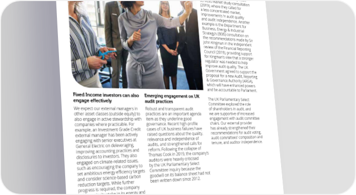 26 www.ppf.co.uk Responsible Investment Report 2019/20 27 Being active owners – continued A p Our external provider has Voting activity in 2019/20 p r o contributed to a number of Case study ach consultations on our behalf, such as the Competition and Markets Aside from climate change-related most frequently in the North American Voting on board Authority’s (CMA) Statutory audit voting activities, including shareholder region (74 per cent of resolutions), composition services market study consultation resolutions, which are covered in more where 24 per cent of our votes were in (2019), where they called for detail in the Managing climate change support of shareholder proposals. and diversity a less concentrated market, risks and opportunities section on improvements in audit quality page 33, we provide a summary of the Our most common rationale for and audit independence. Another key themes within our voting activities supporting was that the proposal Board composition and example is the Department for during 2019/20. promoted appropriate transparency, diversity is critical to company Business, Energy & Industrial accountability or incentivisation. 1 E management , so we increased Strategy’s (BEIS) consultation on xe Segregated equities voting Opposition to remuneration-related our expectations on gender c u the recommendations made by Sir t activity resolutions was our primary concern diversity within our issuers this io John Kingman in the independent For our segregated equities, our in the UK, Australia and New Zealand year. For UK companies, our n review of the Financial Reporting regions, and concerns around external provider developed Council (2019), providing support external provider voted on our behalf board structure were highest in the a board-level diversity for Kingman’s view that a stronger on 7,260 total resolutions at 643 US, developed markets in Asia and recommendation to have 30 regulator was needed to help meetings during the 2019 calendar emerging markets. per cent women on FTSE 100 improve audit quality. The UK year and opposed 15% boards and 25 per cent on Government agreed to support the of these resolutions. An overview of our voting records by FTSE 250 boards. This also proposal for a new Audit, Reporting geography and ESG issues can be extended to guidelines to vote & Governance Authority (ARGA), Our role as a responsible shareholder seen in further detail in our annual entails holding management to against the chair of any FTSE which will have enhanced powers Voting & Engagement report – L o and be accountable to Parliament. account, and we opposed one or 100 company without a woman o https://ppf.co.uk/reporting-investing- k more resolutions in over 60% of these on its executive committee. in transparently g Fixed Income investors can also Emerging engagement on UK f The UK Parliamentary Select meetings. We opposed management We believe it is important to o r engage effectively audit practices Committee explored the role connect up our engagement w ar We expect our external managers in Robust and transparent audit of shareholders in audit, and Breakdown of the 15% opposed resolutions and voting activities, so d other asset classes (outside equity) to practices are an important agenda we are supportive of increased we wrote to 13 FTSE 100 also engage in active stewardship with item as they underline good engagement with audit committee companies, expressing companies where practicable. For governance. Recent high-profile chairs. Our external provider our concerns on gender example, an Investment Grade Credit cases of UK business failures have has already strengthened their 944 diversity, and held follow-up external manager has been actively raised questions about the quality, recommendations for audit voting, conversations with a number engaging with senior executives at relevance and independence of audit committees' composition and of them. General Electric on deleveraging, audits, and strengthened calls for tenure, and auditor independence. improving accounting practices and reform. Following the collapse of Votes 1 See Catalyst, Why Diversity and disclosures to investors. They also Thomas Cook in 2019, the company’s Inclusion Matter: engaged on climate-related issues, auditors were heavily criticised 121 Financial Performance (24 June 2020) such as encouraging the company to by the UK Parliamentary Select https://www.catalyst.org/research/why- 19 diversity-and-inclusion-matter-financial- set ambitious energy efficiency targets Committee inquiry because the performance/ (accessed 03/07/20); and consider science-based carbon goodwill on its balance sheet had not Against Abstained With management World Economic Forum article reduction targets. While further been written down since 2012. by expection https://www.weforum.org/agenda/ progress is required, the company Source: EOS at Federated Hermes (external provider) 2019 2019/04/business-case-for-diversity-in- sold a majority stake in its energy and the-workplace/ (accessed 03/07/20). oilfield services subsidiary in 2019 and stepped up its disclosures. Voting against management or abstaining by ESG issue For pooled equity funds, where 5% 0% Board Other possible, we engage with our 7% 43% structure external managers in advance of Audit and high-profile votes or resolutions 8% Remuneration accounts to obtain insights on their views. Shareholder Amend articles We also discuss their voting 8% activities as part of our ongoing resolution Poison pill/ external manager monitoring and 10% Capital anti-takeover reporting processes – this includes structure and device engagement around disclosure dividends quality on voting activities, as 20% we see this as a crucial area for improvement across the industry. Source: EOS at Federated Hermes (external provider) 2019