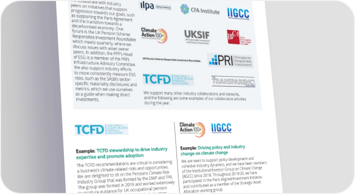 28 www.ppf.co.uk Responsible Investment Report 2019/20 29 Being active owners – continued A p p Collaborative efforts r o to engage and improve ach RI standards across asset classes Example: Continuing efforts to drive Example: Leveraging PRI’s Collaboration diversity and inclusion in industry Platform following mining disaster We collaborate with industry At an organisational level, diversity and inclusion is a vital The collapse of Vale’s dam at Brumadinho (January peers on initiatives that support commitment for the PPF and we look to encourage and 2019) killed more than 250 people consisting primarily progression towards our goals, such promote best practice, for example through gender, of employees, and Vale lost $1.6 billion (US) attributed to as supporting the Paris Agreement ethnicity and disability working groups. Upon signing the related costs in just the first quarter of the year. Women in Finance Charter two years ago, we committed E and the transition towards a to having 40 per cent female representation within Through the PRI, we joined a collaborative engagement to xe c decarbonised economy. One u senior management by 2021. In October 2019, we hit push for a transparent investigation into the causes of the t forum is the UK Pension Scheme io Responsible Investment Roundtable this target two years early. collapse, as well as encouraging the company to outline a n which meets quarterly, where we preventative action plan. Lack of appropriate governance, discuss issues with asset owner We are also members of The Diversity Project, with technical faults and overdue maintenance were identified peers. In addition, the PPF’s Head a PPF Executive Committee member on its Advisory as key causes. of ESG is a member of the PRI's Committee, and our Director of Legal, Compliance and Infrastructure Advisory Committee. Ethics on its Steering Committee. This engagement Vale was challenged to review its safety management We also support industry efforts adds another facet to our aspiration to promote a more procedures, and the board stepped in and appointed to more consistently measure ESG sustainable financial system, and within our investments, independent expert committees to oversee the response risks, such as the SASB’s sector- we have been working with both external managers to the situation. This led to changes in management and investee companies to support improvements in and the appointment of a new CEO, increased focus L specific materiality disclosures and o diversity and inclusion. on corporate culture and safety and operational goals. o metrics, which we use ourselves k We support many other industry collaborations and networks, Vale set a target to reduce its reliance on tailings dams, in as a guide when making direct g f and the following are some examples of our collaborative activities increasing the use of dry proceedings to 70 per cent of o investments. r during the year. its total volume by 2023. However, the company can still w ar improve engagement with families of its employees and d members of the local community affected. The tragic event highlighted the importance of active investor engagement, and opened up opportunities to engage across the sector more broadly, such as with the Investor Mining and Tailings Safety Initiative and the International Council on Mining and Metals (ICMM) independent review of global standards. Example: TCFD stewardship to drive industry Example: Driving policy and industry expertise and promote adoption change on climate change The TCFD recommendations are critical in considering We are keen to support policy development and a business’s climate-related risks and opportunities. cohesive industry dynamics, and we have been members We are delighted to sit on the Pensions Climate Risk of the Institutional Investor Group on Climate Change Industry Group that was formed by the DWP and TPR. (IIGCC) since 2018. Throughout 2019/20, we have The group was formed in 2019 and worked extensively participated in the Paris Aligned Investment Initiative, to produce guidance for UK occupational pension and contributed as a member of the Strategic Asset schemes around TCFD alignment to help trustees Allocation working group. assess, manage and report on climate-related risks. The open consultation for the guidance was launched Robust, transparent and strategic reporting by in March 2020. companies is vital, and we demonstrate our support for this through membership of CDP and the Transition We also promote the TCFD recommendations to our Pathway Initiative (TPI). We are also a signatory of Climate external managers to encourage acceptance, and seek Action 100+, which targets the 100 largest corporate to see an increase in TCFD alignment, which includes greenhouse gas emitters (accounting for two thirds of scenario analysis of both physical and transition annual global industrial emissions) and 61 other focus risks. Many of our external managers are already companies, to take necessary action on climate change. TCFD supporters and are working towards increased The initiative’s ultimate goal is to limit global warming to disclosure. Likewise, we expect our external managers less than 2°C, which it aims to do through encouraging to engage with underlying issuers on the same these companies to curb emissions, improve governance disclosure expectations. and strengthen climate-related financial disclosures.