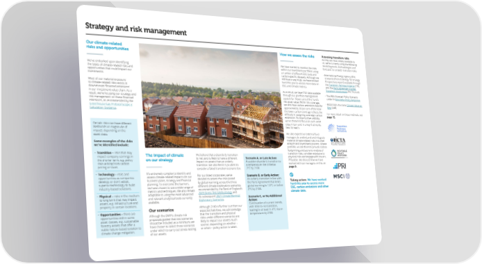 Strategy and risk management Our climate-related How we assess the risks Assessing transition risks risks and opportunities As they are most widely available to us, we’re currently using the following modelling tools, methodologies and We have started to monitor the risks forecasts to consider transition risks: We’ve embarked upon identifying within our investment portfolios using the types of climate-related risks and a number of di昀昀erent ESG tools and • International Energy Agency (IEA) opportunities that could impact our carbon-speci昀椀c datasets. Although we scenarios (from its Energy Technology investments. still have a way to go, we have worked Perspectives report) available through hard this year to access more data on the Transition Pathway Initiative (TPI) Most of our material exposure ESG and climate metrics. and the Paris Agreement Capital to climate-related risks exists in Transition Assessment (PACTA) tools As a result, we have ESG data available downstream ‘昀椀nanced emissions’ through our portfolio management • The PRI’s Forecast Policy Scenario in our investment value chain. As a system for 70 per cent of the Fund’s under its Inevitable Policy Response result, we’re focusing our strategy and net asset value. Within this coverage, risk management on these 昀椀nanced we also have carbon emissions data for • MSCI ESG’s Portfolio Climate Value-at- emissions, as recommended by the approximately 30 per cent of the total – Risk (VaR) Greenhouse Gas Protocol Scope 3 Calculation Guidance. the lower carbon coverage re昀氀ects the For more detail on these methods, see di昀케culty in assigning sovereign carbon page 15. emissions. To drive further visibility, we’ve chosen to focus on each asset class in turn and in a way that works Certain risks can have di昀昀erent best for each. likelihoods or magnitude of impact, depending on the We also expect our external fund asset class. managers to understand and integrate Some examples of the risks material climate-related risks into their we’ve identified include: analysis and investment process. Where possible, we ask them to provide carbon footprinting and scenario analysis of • Transition – risks that may The impact of climate We believe that a disorderly transition transition risks, consider exposure to impact company earnings in Scenario A, or Late Action: physical risks and engage with issuers, the shorter term, e.g. policy on our strategy to net zero is likely to have a di昀昀erent if feasible. We discuss how we have risks arising from carbon impact on assets than an orderly A sudden disorderly transition to worked with our managers on this on pricing or taxes. transition. We also feel it is prudent to a temperature rise of below page 9. consider a failed transition scenario too. 2°C by 2100. • Technology – risks and It’s extremely complex to identify and For our listed corporates, we’ve Scenario B, or Early Action: opportunities as companies assess climate-related impacts on our decided to assess the risks posed An orderly transition in line with develop, or don't adopt, business plans, strategy and 昀椀nancial by global warming across the three the Paris Agreement that limits Taking action: We have worked superior technology to build planning. To overcome the barriers, hard this year to access more industry-based solutions. we have chosen to use a wide range of di昀昀erent climate exploratory scenarios global warming to 1.5°C or below metrics and techniques. We also remain recommended by the Bank of England’s 2°C by 2100. ESG, carbon emissions and other • Physical – risks in the medium adaptable to using the most advanced 2019 Stress Test Methodology and climate data. to long term that may impact and relevant analytical tools currently its subsequent 2021 Climate Biennial Scenario C, or No Additional assets, e.g. infrastructure and available. Exploratory Scenarios. Action: property in certain locations. Although 2100 is further out than our Continuation of current trends, Our scenarios expected liabilities, we acknowledge with little-to-no transition, • Opportunities – there are Although the DWP’s climate risk that the transition and physical leading to at least 3–4°C rise in opportunities within some temperature by 2100. asset classes, e.g. sustainable proposals guided that two scenarios risks under di昀昀erent scenarios are forestry assets that offer a should be included as a minimum, we likely to impact our assets much viable nature-based solution to have chosen to select three scenarios sooner, depending on whether – climate change mitigation. under which to carry out stress testing or when – policy action is taken. of our assets.