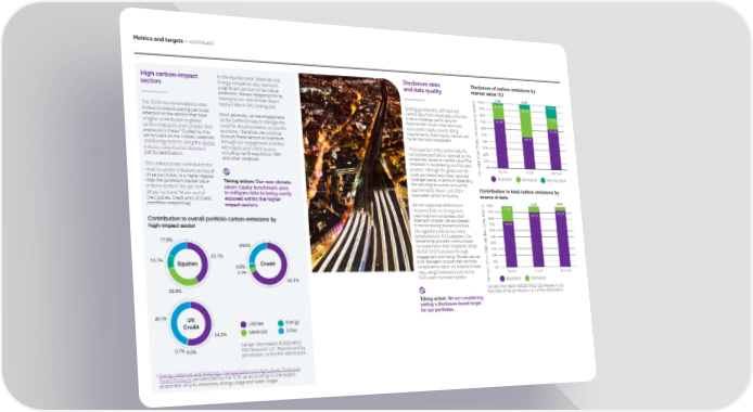 Metrics and targets – continued Disclosure rates Disclosure of carbon emissions by High carbon-impact In the Equities book, Materials and and data quality market value (%) sectors Energy companies also represent 2.3% 6.9% 100% a signi昀椀cant portion of the overall 22.8% 19.0% emissions. We are mitigating this by 90% 44.0% moving to our new climate-aware Getting good quality, self-reported 80% The TCFD recommendations steer equity index in the coming year. carbon data from corporates continues 17.7% investors towards paying particular to be a challenge, particularly for 70% 74.9% More generally, we see engagement attention to the sectors that have 昀椀xed income issuers that don't also 60% 63.2% a higher contribution to global as the preferred way to manage the issue public equity. Due to listing 50% carbon emissions and consider their need for decarbonisation across the requirements, listed equity markets are 49.1% 1 economy. Therefore, we continue by far the most transparent. 40% exposure to these. Guided by this, to push these sectors to transition we focused on the Utilities, Materials 30% and Energy sectors, using the Global through our engagement activities Three quarters of the carbon data for 20% Industry Classi昀椀cation Standard with equity and credit issuers, our Equities portfolio is reported by the including via Climate Action 100+ companies, based on market value. The 10% (GICS) classi昀椀cation. and other initiatives. remainder is modelled by our ESG data 0% The Utilities sector contributes the provider. Although the global and UK Per cent of portfolio disclosure by sourceEquitiesCreditUK Credit most to carbon emissions across all credit portfolios have lower reported Reported Estimated Not disclosed three portfolios, to a higher degree coverage overall, in terms of materiality, than the portfolio’s market value Taking action: Our new climate- the reporting issuers do account for in these sectors; 昀椀ve per cent, aware equity benchmark aims approximately 90 per cent of the Contribution to total carbon emissions by 39 per cent and 19 per cent of to mitigate risks in being overly associated carbon emissions. source of data the Equities, Credit and UK Credit exposed within the higher We are supportive of disclosure 100% 9.5% 6.5% portfolios respectively. impact sectors. measures that are driving more 25.4% 90% 90.5% 93.5% reporting from corporates, both 80% Contribution to overall portfolio carbon emissions by listed and unlisted. We are pleased 70% 74.6% high-impact sector to see increasing momentum from the regulatory side across many 60% 17.9% jurisdictions for TCFD adoption. Our 50% 24.5% stewardship provider communicates 40% our expectation that companies adopt 30% the full TCFD framework through 10.2% 42.1% engagement and voting. We also ask our 20% Equities 4.0% Credit fund managers to push their portfolio 10% 3.2% companies to report on material climate 0% risks, using frameworks such as the Equities Credit UK Credit 68.3% TCFD, even in private markets. Per cent of portfolio disclosure by sourceReportedEstimated 29.8% Certain information ©2020 MSCI ESG Research LLC. Reproduced by permission; no further distribution. Taking action: We are considering setting a disclosure-based target 45.1% UK for our portfolios. Credit Utilities Energy 54.2% Materials Other 0.7% Certain information ©2020 MSCI 0.0% ESG Research LLC. Reproduced by permission; no further distribution. 1 Energy, Materials and Buildings, Transportation and Agriculture, Food and Forest Products are identi昀椀ed by the TCFD as accounting for the largest proportion of GHG emissions, energy usage and water usage.