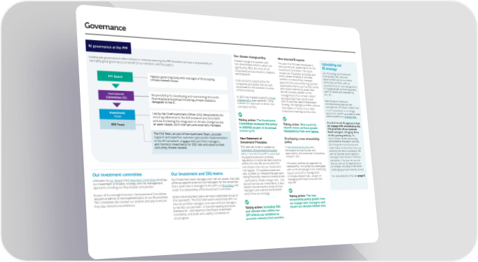 Governance RI governance at the PPF Our climate change policy New internal RI reports Climate change is a systemic and This year the ESG team developed a Upholding our Inadequate governance is often a factor in schemes entering the PPF, therefore we have a responsibility to non-diversi昀椀able concern, which can new quarterly RI update report for the RI strategy exemplify good governance on behalf of our members and levy payers. signi昀椀cantly a昀昀ect the value of our Investment Committee. The report Our RI strategy and framework investments across the short, medium reviews our RI policies, processes and incorporates ESG risks and and long term. policy review schedule. It provides opportunities across our entire updates on stewardship, manager investment portfolio, with an PPF Board Highest governing body with oversight of RI (including It also presents opportunities for appointments and monitoring, and key essential focus on risk management. climate-related) issues. companies and assets that are well- quantitative metrics such as ESG scores It’s implemented by the Investment positioned for the transition to a low- and carbon intensity by asset class. and ESG teams and overseen by carbon economy. We also provide updates on the management of our climate-related the CIO. Investment Responsibility for developing and maintaining the Fund’s In 2019, we 昀椀nalised a speci昀椀c climate and other ESG risks monthly with Identifying our exposure Committee (IC) RI principles and policies (including climate-related) is change policy (see Appendix 1) that the CIO and the Head of Investment and determining appropriate delegated to the IC. outlines our approach to these risks Strategy. We highlight portfolio-relevant management of climate-related risks and opportunities. information or events in our daily in our investments is a strategic investment meetings as they arise. priority for the PPF, as a speci昀椀c area Investment Led by the Chief Investment Officer (CIO). Responsibility for of focus within our Strategic Plan. Team ensuring adherence to the RI framework and associated Taking action: The Investment It is vital to our RI approach that policies (including the integration of climate change) across Committee reviewed this policy Taking action: New quarterly we engage with and advance the ESG Team all asset classes, both internally and externally managed. in 2020/21 as part of its annual reports mean we have greater ESG practices of our external review cycle. transparency than ever before. fund managers, bringing them The ESG Team, as part of the Investment Team, provides on the journey with us. We support and expertise, oversees appropriate implementation New Statement of Developing a new stewardship continuously review all existing of the RI framework, engages with portfolio managers, Investment Principles policy and potential managers’ policies, and monitors investments for ESG risks and opportunities A new stewardship policy was ESG integration processes and (including climate-related). This year we chose to update our reporting to ensure they meet our Statement of Investment Principles developed during the year and evolving minimum standards. We (SIP), in line with the DWP’s amended approved by the Investment Committee will not allocate more capital to occupational pension schemes in March 2021. managers that fall short of these regulations, to advocate best practice. standards. This year, we carried Within the new SIP, we included ESG This policy outlines our approach to this out with an increasing focus and climate risks into our investment stewardship – including how we engage on climate, including in the more risk register. The updated statement with our fund managers and underlying challenging private markets assets. Our investment committee Our Investment and ESG teams also outlines our stewardship approach, issuers around the management of climate-related risks – as part of Overseen by our Board, the Investment Committee develops Our Investment team manages over half our assets internally, taking 昀椀nancially material considerations For more detail on this, see page 9. our investment principles, strategy and risk management while we appoint external fund managers for the remainder. – particularly climate change risks – into managing the Fund, in line with the approach, including our RI principles and policies. Every asset class is managed in line with our RI strategy and account across our investments. It also new SIP. under the stewardship of the Investment Committee. details how we monitor external fund As part of its oversight function, the Investment Committee managers and outlines the RI beliefs requires evidence of the implementation of our RI processes. Within the Investment team, we have a dedicated group of which drive our strategy. The Committee also reviews our policies annually to ensure ESG specialists. This ESG team works extensively with our Taking action: The new they stay relevant and ambitious. internal portfolio managers and external fund managers stewardship policy guides how to monitor our portfolio – in line with leading disclosure we engage with managers and frameworks – and reports to the Board, Investment Taking action: Including ESG issuers on climate-related risks. Committee, and Asset and Liability Committee on and climate risks within our SIP reflects our ambition to our progress. promote industry best practice.
