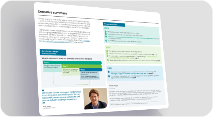 Executive summary Climate change is one of the biggest issues on the global agenda Our achievements – one that has the potential to impact economies, businesses and people everywhere. We’re committed to managing these risks and 2019 opportunities across our investments on behalf of our members. This focused climate report shows how we are active in assessing Climate change policy and strategy approved by the Board and managing climate-related risks and opportunities across our Independent carbon audit of our listed equity and credit portfolios investment portfolio. It details our climate-related governance Minimum Environmental, Social and Governance (ESG) and carbon requirements integrated framework, strategy, risk management processes and chosen in fund legal documents metrics, aligning with the Financial Stability Board Task Force on TCFD disclosures reported in our Annual Report and Accounts Climate-related Financial Disclosures (TCFD) framework. 2020 First dedicated Responsible Investment (RI) report published Our climate change Climate measurements embedded into our portfolio management systems (see page 7, 9) strategic journey ESG and carbon reporting template mandated for external managers – 100 per cent of our Liquids managers now report this way (see page 9) We will continue to refine our processes and set new standards Stewardship services expanded to cover our in-house fixed income and cash books (see page 9) Step 1 Recognise and understand Step 2 the challenge facing us. 2021 Build out risk management, Step 3 monitoring and reporting New climate-aware equity benchmark designed to meet our investment strategy while processes. Evaluate results and determine 1 action points. reducing our exposure to climate risks by at least 50 per cent (see page 10) Refine processes as required, Innovative pilot project launched to develop an approach for assessing the Paris Agreement incorporating new data/methods. alignment of all our asset classes (see page 8) Next steps We see our climate strategy as fundamental We believe our achievements to date significantly reduce the risks facing our portfolio, without to our long-term investment goals. We can compromising our underlying investment strategy. Now we have better access to data and insight, reduce risk, ensure we are sustainable and we will keep evaluating and determining actions we can take to mitigate these risks further. provide industry-leading transparency. We will continue to take a leadership role as we refine our processes further and set new standards in other asset classes where access to data and tools is still scarce. Oliver Morley Chief Executive O昀케cer 1 When compared to FTSE All-World Index carbon emissions and reserves intensity