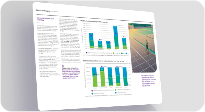 Metrics and targets – continued Exposure to fossil fuel The UK Credit portfolio, although not Weight of holdings owning fossil fuel reserves activities measured against a benchmark, does have some exposure to companies 12.0% with fossil fuel reserves. However, all 11.0% 5.3% of the companies with reserves, with The risk of fossil fuel assets becoming the exception of one, have strong 10.0% management quality (MQ) scores for 9.0% stranded is a signi昀椀cant concern in climate-related strategy (as assessed by both an orderly or disorderly transition the TPI). 8.0% 7.9% towards net zero emissions by 2050. 7.0% 3.2% In fact, the most carbon-intensive The ‘weight of holdings’ metric tells us 6.0% 6.1% 5.2% 6.3% assets are likely to become stranded what our exposure is to companies much sooner. This is due to the falling that have reserves on their balance 5.0% 1.8% cost of renewable energy production sheet, but doesn’t give insight into the 4.0% 4.4% and rising carbon prices in regions with magnitude of potential emissions that 3.0% 1.6% 1.7% 1.9% emissions trading schemes or carbon might be released from the burning Per cent weight in portfolio3.0% 3.0% taxes. Thermal coal is unarguably facing of these reserves. Therefore, we have 2.0% 1.5% 1.8% also assessed the potential embedded 1.9% transition risks in the next 昀椀ve to ten emissions and contribution by reserve 1.0% years within the OECD regions. 1.2% 0.8% 1.2% type, as shown in the chart to the right. 0.0% 0.3% As a result, we assessed our portfolios’ Equities Equities benchmark Credit Credit benchmark UK Credit exposure to fossil fuel reserves by Our Equities portfolio has approximately overall percentage, as well as by 40 per cent lower embedded emissions Weight of companies owning any fossil fuel reserves Thermal coal Gas Oil than its benchmark, and our global fuel type. Credit portfolio has approximately 50 Certain information ©2020 MSCI ESG Research LLC. Reproduced by permission; no further distribution. The Equities portfolio has higher per cent lower embedded emissions. exposure than our equity benchmark. Both the global Credit and UK Credit As this is beyond a level we’re portfolios have minimal exposure to Potential emissions from reserves and contribution from reserves type comfortable with, it was a fundamental potential emissions from thermal coal. consideration in the design of our 30,000,000 120% new climate-aware equity index and we expect a signi昀椀cant reduction 26,116,086 25,958,559 to our exposure post-transition 25,000,000 100% to the new index. Taking action: Although the 29.7% 8.4% 39.1% 40.0% 51.9% Equities portfolio already has 10.8% The global Credit portfolio has lower thermal coal embedded 20,000,000 80.8% 80% a low exposure overall – especially emissions than its benchmark, in thermal coal – and when compared we have sought to reduce 15,000,000 15,868,662 60% to its benchmark. this further within the new 16.5% 13,312,590 44.8% We have sought to climate-aware index. 53.8% 53.4% 47.1% signi昀椀cantly reduce 10,000,000 40% our exposure to fossil 5,000,000 20% fuel reserves in our 15.1% new climate-aware 7.5% 1.0% 292,085 Potential embedded emissions in tonnes0 0% equity index. Equities Equities benchmark Credit Credit benchmark UK Credit Potential emissions from fossil fuel reserves Contribution from thermal coal Contribution from gas Contribution from oil Certain information ©2020 MSCI ESG Research LLC. Reproduced by permission; no further distribution.