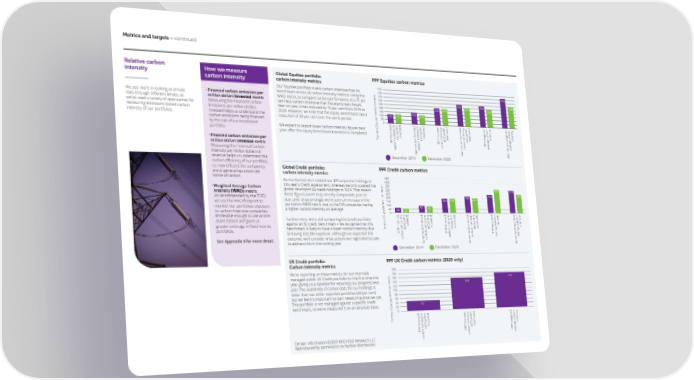 Metrics and targets – continued Relative carbon How we measure Global Equities portfolio: PPF Equities carbon metrics intensity carbon intensity carbon intensity metrics Our Equities portfolio is less carbon-intensive than its 450 400 414 • Financed carbon emissions per benchmark across all carbon intensity metrics. Using the 350 We see merit in looking at climate WACI metric to compare carbon performance, it is 19 per 300 294 290 299 million dollars invested metric 250 risks through di昀昀erent lenses, so Measuring the Financed Carbon cent less carbon-intensive than the equity benchmark. 200 230 226 257 243 we’ve used a variety of approaches for Year-on-year, it has reduced by 16 per cent from 2019 to 150 measuring emissions-based carbon Emissions per million dollars 2020. However, we note that the equity benchmark saw a 100 116 122 155 125 intensity of our portfolios. invested helps us understand the reduction of 30 per cent over the same period. 50 e per $million metric carbon emissions being 昀椀nanced 2 0 by the size of our investment d We expect to report lower carbon intensity 昀椀gures next e/$m e/$m e/$m portfolio. year, after the equity benchmark transition is completed. 2 2 e/$m2 2 intensity intensity invested) invested) revenues) revenues) (tCO (tCO (tCO (tCO • Financed carbon emissions per Tonnes CO PPF financed PPF finance PPF weighted average carbon average carbon carbon intensity million dollars revenue metric carbon intensity carbon emissions Measuring the Financed Carbon carbon emissions Benchmark financed Benchmark financed Intensity per million dollars of Benchmark weighted revenue helps us understand the December 2019 December 2020 carbon e昀케ciency of our portfolio, i.e. how e昀케cient the companies Global Credit portfolio: PPF Credit carbon metrics are at generating output per carbon intensity metrics tonne of carbon. As mentioned, we included our EM corporate holdings in 450 400 • Weighted Average Carbon this year’s Credit assessment, whereas we only covered the 350 Intensity (WACI) metric global developed IG credit holdings in 2019. That means 300 318 313 250 250 255 As recommended by the TCFD, these 昀椀gures aren’t truly directly comparable year-on- 200 219 203 we use the WACI footprint to year, and, unsurprisingly, we’ve seen an increase in the 150 193 192 monitor our portfolios’ exposure portfolio’s WACI metric due to the EM companies having 100 91 85 50 65 to carbon-intensive companies. a higher carbon intensity on average. 53 e per $million metric20 d It’s 昀氀exible enough to use across Furthermore, we’re still comparing the Credit portfolio e/$m e/$m e/$m asset classes and gives us against an IG credit benchmark – we recognise that this 2 2 e/$m2 2 intensity intensity invested) greater coverage in 昀椀xed income invested) revenues) revenues) (tCO (tCO (tCO (tCO portfolios. benchmark is likely to have a lower carbon intensity due Tonnes CO PPF financed PPF finance to having less EM exposure. Although we expected this PPF weighted average carbon average carbon carbon intensity carbon intensity outcome, we’ll consider what actions we might wish to take carbon emissions See Appendix 3 for more detail. carbon emissions to address this in the coming year. Benchmark financed Benchmark financed Benchmark weighted December 2019 December 2020 UK Credit portfolio: PPF UK Credit carbon metrics (2020 only) Carbon intensity metrics We’re reporting on these metrics for our internally 200 180 managed public UK Credit portfolio for the 昀椀rst time this 160 175 year, giving us a baseline for reporting our progress next 140 153 year. The availability of carbon data for our holdings is 120 lower than our other reported portfolios (60 per cent) 100 but we feel it’s important to start measuring what we can. 80 60 This portfolio is not managed against a speci昀椀c credit e per $million metric4047 benchmark, so we’ve measured it on an absolute basis. 2 20 0 Tonnes CO e/$m2 e/$m2 intensity invested) (tCO (tCOrevenues) PPF financed PPF financed PPF weighted average carbon carbon intensity Certain information ©2020 MSCI ESG Research LLC. carbon emissions Reproduced by permission; no further distribution.