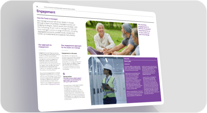 Pension Protection Fund Responsible Investment Report 2020/21 16 Engagement How the Fund is managed We prioritise We manage around half of our assets in-house, engagements in through a team of portfolio managers across LDI themes of greatest hedging strategies, hybrid assets and strategic cash. importance to us, The remaining 50 per cent is managed by external in sync with our fund managers across a range of vehicles, including own RI strategy. segregated accounts, pooled funds, closed-end funds, co-investments and passive instruments. Our approach to Our engagement approach engagement for the assets we manage Engagement is a driving force behind Engagement in LDI assets our RI strategy and we’ll always exhaust Our objective is to improve the it before considering divestment. However, there’s a real need to boost e昀케ciency and functioning of markets through collaboration on important Case study transparency around engagement, issues with stakeholders and especially in asset classes such as policymakers. As a large participant in Green gilts sovereign debt and private assets, the Gilt market, we regularly engage which could have the greatest potential with the DMO and HM Treasury. for impact. Over the past year, we’ve This involves taking part in annual In October 2020, we supported the express our opinion. We therefore worked hard to improve this and consultations, forums and investor Green+ Gilt Proposal developed by took part in a closed-door working support our managers to engage with roundtables. the III, Green Finance Institute and group organised by the III to the entities in their portfolios. Grantham Research Institute. develop potential metrics and We prioritise engagements in themes measurement frameworks for of greatest importance to us, in sync Green gilts are a sovereign bond environmental and social co- with our own RI strategy. As part of this with an aim to attract private bene昀椀ts reporting. we work closely with our stewardship Taking action: sector capital into the green This year we provided support recovery and social renewal. As part of this, we highlighted provider to de昀椀ne focus areas and and insight on developing the Following the Chancellor’s the importance of ensuring provide feedback on them. More UK’s green gilt issuance. announcement, in the Spring 2021 diversity is considered in the detail on our engagement approach Budget, of at least £15 billion in just transition to a low carbon was provided in last year’s RI report. green gilts issuance, the III was world, as some technology and As a participant in derivatives markets, appointed as Secretariat of the infrastructure industries are still we already have an established new Stakeholder Discussion Forum very heavily male-dominated. We oversight process for our bank on green 昀椀nance, set up by HM welcome the development of the counterparties. However, over the Treasury and the DMO. UK Government Green Financing coming year we’ll be exploring how to Framework, although we believe further embed ESG considerations and While our participation in any such the right requirements must be engagement practices of counterparties issuance will be based on it meeting put in place to report on the use of to strengthen our ongoing assessments our investment requirements, as proceeds and impact. of and reduce counterparty risks related active stewards it’s important to to ESG issues.