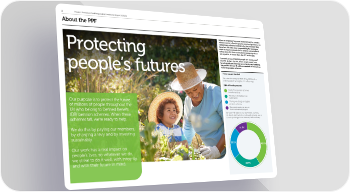 Pension Protection Fund Responsible Investment Report 2020/21 2 About the PPF When an employer becomes insolvent and its pension scheme cannot a昀昀ord to pay its promised pensions, we compensate scheme members for the pensions they have lost. We take over responsibility for payments once we have assessed that a scheme cannot a昀昀ord to buy bene昀椀ts from an insurance company which Protecting are equal to, or more than, the PPF would pay. Currently around 288,000 people are members of the PPF. Before the PPF, these people could have faced signi昀椀cant 昀椀nancial uncertainty and hardship. We protect almost 10 million members of more than people’s futures 5,000 DB pension schemes. How we are funded We raise the money we need to pay PPF bene昀椀ts and the cost of running the PPF in four ways: Split of funding sources Assets from pension schemes transferred to us The return we make on our investments Our purpose is to protect the future The levy we charge on eligible of millions of people throughout the pension schemes Recovered assets we secure UK who belong to Defined Benefit from insolvent employers (DB) pension schemes. When these We have £38 billion in our investment portfolio (31 March 2021) which is continually growing, and is schemes fail, we’re ready to help. currently managed both internally and externally. We do this by paying our members, 11.5% by charging a levy and by investing sustainably. 23.1% 41.5% Our work has a real impact on people’s lives, so whatever we do, we strive to do it well, with integrity and with their future in mind. 23.9%