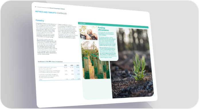 27 Pension Protection Fund Climate Change Report 2021/22 METRICS AND TARGETS CONTINUED Forestry CASE STUDY Sustainable forestry is a key element of Forestry certi昀椀cation is vital to Funding our RI strategy as it can help mitigate ensuring good management practices, CO2 emissions by storing carbon. preserving high conservation-value a昀昀orestation This makes sustainable forestry assets forests and combating deforestation. one of the few viable nature-based It is a metric that we comprehensively In the past year, we participated in investment solutions in the journey track – see panel below to see the the seeding of a new a昀昀orestation towards a Net Zero world. Well- level of certi昀椀cation in our portfolio. fund in Scotland. managed forests can also increase Fluctuations over the years are primarily The strategy combines existing biodiversity and are more resilient driven by new acquisitions of land, productive land with newly-acquired to the e昀昀ects of climate change. especially for a昀昀orestation projects. land where new planting will take We currently invest in soft and place and contribute towards the hardwood forestry assets globally, with generation of carbon credits. We are investments in Australia, New Zealand, proud to be one of the 昀椀rst UK asset the US, the UK, Ireland, the Baltics and owners to be part of such a project. the Nordics. We work closely with Although global decarbonisation is our managers and are glad to see critical to tackling global warming, continuous progress in their practices we recognise that carbon credits and consideration of climate risks. All will remain part of the solution for of our managers have now started any hard-to-abate emissions while measuring the carbon sequestration also creating a crucial incentive to of their forestry assets. develop forestry assets as long-term sinks to sequester carbon. Certi昀椀cation of the PPF’s share of timberland 2019 2020 2021 98.2% 93.1% 98.4% Certi昀椀ed timberland in accordance with the FSC and/or PEFC Timberland in the process of certi昀椀cation 0.2% 5.8% 1.6% in accordance with the FSC and/or PEFC Land that is sustainably managed in 0.2% 0.0% 0.0% accordance with the FSC and/or PEFC, but that cannot be certi昀椀ed Other 1.4% 0.3% 0.0%