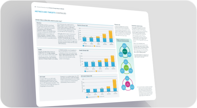24 Pension Protection Fund Climate Change Report 2021/22 METRICS AND TARGETS CONTINUED 18 Climate Value-at-Risk 2021 results by asset class Physical risk Technology opportunities In terms of physical risk, all three Technology opportunities are likely Equities This is because the model projects Equities Climate VaR portfolios are primarily exposed to to bene昀椀t our portfolios most in a Our Equities portfolio would see higher uptake of electri昀椀cation in the extreme heat, tropical cyclones and disorderly transition (1.5°C and 2°C) the greatest Climate Value-at-Risk transportation sector in a disorderly 60% coastal 昀氀ooding, although the sectors and least in a hot house world. Equities under a 1.5°C disorderly transition, world, and Food & Staples do not have k 37.8% most at risk do di昀昀er for each portfolio. see the highest potential bene昀椀t, many technology opportunities to s 50% followed by a 2°C disorderly i Below, we depict the top three sectors with Technology VaR contributing transition. Within our Equities book, compensate for their transition risk. t r40% that contribute the most to Physical up to a positive 15 per cent in a e a 21.0% u VaR within each asset class. 1.5°C disorderly scenario. The UK Energy and Materials are the most l exposed sectors in an orderly or Although year-on-year comparisons a 30% Credit portfolio is minimally exposed e v are di昀케cult, we are pleased to see t 1.7% failed transition. However, Food & a 20% 0.5% 7.2% to technology opportunities so its a reduction of 11 per cent for the m i Staples Retailing and Transportation l 18.2% 18.2% 18.2% 18.2% 18.2% Biggest contributing sectors expected Technology VaR is very close Equities Climate VaR year-on-year, l c a 10% to zero. are most at risk in a disorderly world. t to physical risks by portfolio based on the 1.5°C disorderly transition o T 0 scenario combined with the aggressive 3ºC 2ºC 1.5ºC 2ºC 1.5ºC Taking a more detailed sector physical scenario (which are the worst- hot house orderly orderly disorderly disorderly overview, the sector best positioned case scenarios). Food & for technology opportunities is Heavy Aggressive physical risk Transition risk Staples Manufacturing in the Equities portfolio, High Tech Manufacturing or Heavy Manufacturing in the Credit portfolio Credit or failed transition, but Household & Credit Climate VaR Equities and – depending on the scenario – Overall, Climate VaR is lower for Personal Products is most at risk in Rail in the UK Credit portfolio. Credit than for Equities, ranging a disorderly world. This is potentially 20% Telecoms Utilities For all this analysis, it is important to from 7 per cent to 18 per cent under due to higher electricity prices, value k stress that results are modelled and chain costs that the sector must s 10.3% our 昀椀ve scenarios. Transportation i 16% often based on estimates. and Energy are the most exposed absorb and low exposure to low- t r e a12% carbon technologies. u 5.3% sectors in Global Credit in an orderly l a e v 0.2% 2.4% t 8% Real a Estate m 7.3% 7.3% 7.3% 7.3% 7.3% i l l c4% a t o T 0 3ºC 2ºC 1.5ºC 2ºC 1.5ºC Credit hot house orderly orderly disorderly disorderly Aggressive physical risk Transition risk Banks Energy UK Credit However, on a relative basis, the 1.5°C UK Credit Climate VaR Climate VaR for our UK Credit disorderly transition poses the largest portfolios is substantially lower – threat to the portfolio by some margin, 4.0% Food remaining below 4 per cent even mainly arising from Transportation k 2.7% followed by Telecoms sectors. s for a 1.5°C disorderly transition. This i3.0% is likely due to the high allocation to t r e a u Financials in the portfolio. l UK a2.0% Credit e v t a 0.6% Trans- m 0.2% i l1.0% portation Telecoms 18 The Climate VaR of a company, in any given l c 1.0% 1.0% 1.0% 1.0% 1.0% scenario, is simply the present value of the a t o costs impacts in that scenario divided by T 0 the current enterprise market value of the 3ºC 2ºC 1.5ºC 2ºC 1.5ºC company. The enterprise market value is hot house orderly orderly disorderly disorderly computed as the sum of the market values of a company’s equity and debt. The book Aggressive physical risk Transition risk value of debt is used to proxy the market value of debt at the company level.