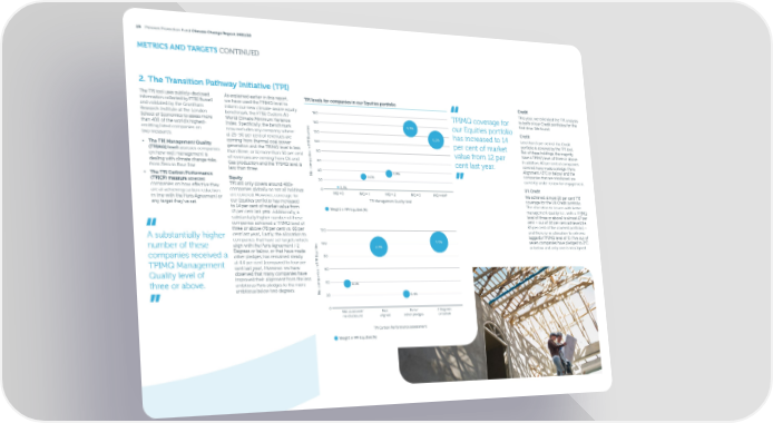 25 Pension Protection Fund Climate Change Report 2021/22 METRICS AND TARGETS CONTINUED 2. The Transition Pathway Initiative (TPI) The TPI tool uses publicly-disclosed As explained earlier in this report, TPI levels for companies in our Equities portfolio Credit information collected by FTSE Russell we have used the TPIMQ level to This year, we extended the TPI analysis and validated by the Grantham inform our new climate-aware equity 160 TPIMQ coverage for to both of our Credit portfolios for the Research Institute at the London benchmark, the FTSE Custom All- 昀椀rst time. We found: School of Economics to assess more World Climate Minimum Variance 140 5.9% our Equities portfolio than 400 of the world’s highest- Index. Speci昀椀cally, the benchmark s Credit e i t emitting listed companies on now excludes any company where: i 120 has increased to 14 u 6.2% Less than 5 per cent of the Credit two measures: a) 25–50 per cent of revenues are q portfolio is covered by the TPI tool. F E100 coming from thermal coal power P per cent of market But of these holdings, the majority • The TPI Management Quality generation and the TPIMQ level is less n P 80 have a TPIMQ level of three or above. (TPIMQ) level assesses companies s i value from 12 per e than three; or b) more than 50 per cent i In addition, 60 per cent of companies n on how well management is of revenues are coming from Oil and a dealing with climate change risks, p 60 cent last year. covered have made a pledge (Paris Gas production and the TPIMQ level is m from Zero to Four Star. o Alignment / 2°C or below) and the less than three. . c 40 o 0.8% companies that are misaligned are • The TPI Carbon Performance N 0.6% currently under review for engagement. (TPICP) measure assesses Equity 20 companies on how e昀昀ective they TPI still only covers around 400+ 0.1% UK Credit are at achieving carbon reduction companies globally so not all holdings 0 MQ = 0 MQ = 1 MQ = 2 MQ = 3 MQ = 4/4* are covered. However, coverage for We achieved almost 20 per cent TPI in line with the Paris Agreement or our Equities portfolio has increased TPI Management Quality level coverage for the UK Credit portfolio. any target they’ve set. to 14 per cent of market value from The allocation to issuers with better 12 per cent last year. Additionally, a Weight in PPF Equities (%) management quality (i.e., with a TPIMQ substantially higher number of these level of three or above) is almost 17 per companies achieved a TPIMQ level of cent – out of 20 per cent achieved (i.e. three or above (78 per cent vs. 66 per 85 per cent of the covered portfolio) – 120 and there is no allocation to extreme A substantially higher cent last year). Lastly, the allocation to laggards (TPIMQ level of 0). Five out of companies that have set targets which 3.9% o align with the Paris Agreement / 2 s 100 seven companies have pledged to 2 C number of these e 3.4% i or below and only one is misaligned. t Degrees or below, or that have made i u companies received a other pledges, has remained steady q 80 F E TPIMQ Management at 4.4 per cent (compared to four per P cent last year). However, we have n P 60 s i e observed that many companies have i Quality level of n a improved their alignment from the less p 40 ambitious Paris pledges to the more m 0.5% three or above. o ambitious below two degrees. . c o N 20 0.4% 0 Not assessed/ Not Paris/ 2 Degrees no disclosure aligned other pledges or below TPI Carbon Performance assessment Weight in PPF Equities (%)