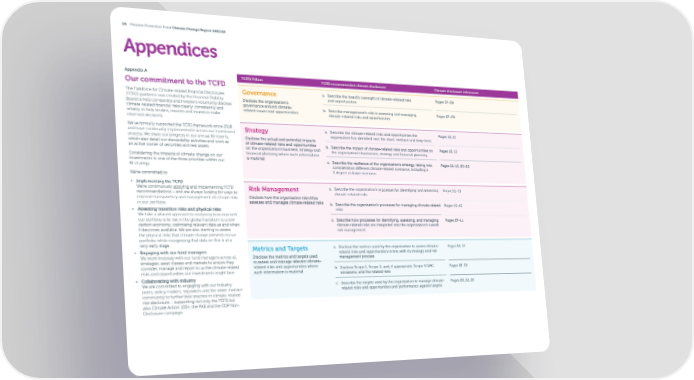 29 Pension Protection Fund Climate Change Report 2021/22 Appendices Appendix A TCFD Pillars TCFD recommended climate disclosure Climate disclosure references Our commitment to the TCFD The Taskforce for Climate-related Financial Disclosures Governance a. Describe the board’s oversight of climate-related risks Pages 07–09 (TCFD) guidance was created by the Financial Stability and opportunities. Disclose the organisation’s Board to help companies and investors voluntarily disclose governance around climate- b. Describe management’s role in assessing and managing Pages 07–09 climate-related 昀椀nancial risks clearly, consistently and related issues and opportunities climate-related risks and opportunities reliably to help lenders, insurers and investors make informed decisions. We’ve formally supported the TCFD framework since 2018 Strategy a. Describe the climate-related risks and opportunities the Pages 10, 13 and have continually implemented it across our investment organisation has identi昀椀ed over the short, medium and long-term process. We share our progress in our annual RI reports, Disclose the actual and potential impacts which also detail our stewardship activities and work as of climate-related risks and opportunities b. Describe the impact of climate-related risks and opportunities on Pages 10, 13 an active owner of securities and real assets. on the organisation’s business, strategy and the organisation’s businesses, strategy and 昀椀nancial planning Considering the impacts of climate change on our 昀椀nancial planning where such information investments is one of the three priorities within our is material c. Describe the resilience of the organisation’s strategy, taking into Pages 12–13, 23–25 RI strategy. consideration di昀昀erent climate-related scenarios, including a 2 degree or lower scenario We’re committed to: • Implementing the TCFD We’re continuously applying and implementing TCFD Risk Management a. Describe the organisation’s processes for identifying and assessing Pages 10–13 recommendations – and are always looking for ways to climate-related risks improve transparency and management of climate risks Disclose how the organisation identi昀椀es, in our portfolio. assesses and manages climate-related risks b. Describe the organisation’s processes for managing climate-related Pages 15–16 • Assessing transition risks and physical risks risks We take a phased approach to analysing how exposed our portfolio is to risk in the global transition to a low- c. Describe how processes for identifying, assessing, and managing Pages 07–11 carbon economy, optimising relevant data as and when climate-related risks are integrated into the organisation’s overall it becomes available. We are also starting to assess risk management the physical risks that climate change presents to our portfolio, while recognising that data on this is at a very early stage. Metrics and Targets a. Disclose the metrics used by the organisation to assess climate- Pages 14, 17 • Engaging with our fund managers related risks and opportunities in line with its strategy and risk We work tirelessly with our fund managers across all Disclose the metrics and targets used management process strategies, asset classes and markets to ensure they to assess and manage relevant climate- consider, manage and report to us the climate-related related risks and opportunities where b. Disclose Scope 1, Scope 2, and, if appropriate, Scope 3 GHG Pages 18–19 risks and opportunities our investments might face. such information is material emissions, and the related risks • Collaborating with industry We are committed to engaging with our industry c. Describe the targets used by the organisation to manage climate- Pages 20, 22, 26 peers, policy-makers, regulators and the wider investor related risks and opportunities and performance against targets community to further best practice in climate-related risk disclosure – supporting not only the TCFD but also Climate Action 100+, the PAII and the CDP Non- Disclosure campaign.