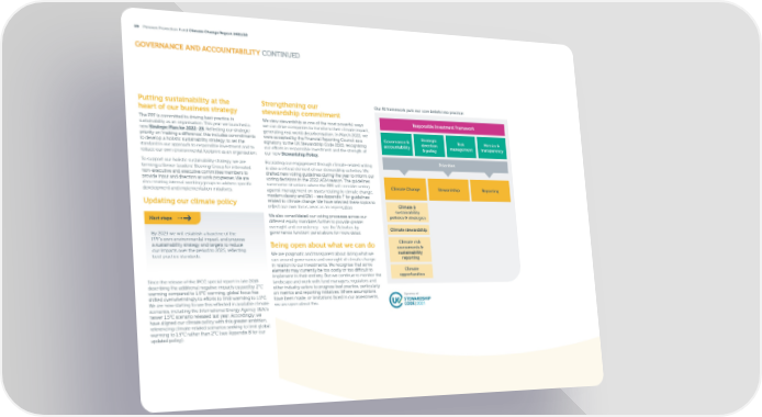 09 Pension Protection Fund Climate Change Report 2021/22 GOVERNANCE AND ACCOUNTABILITY CONTINUED Putting sustainability at the Strengthening our Our RI framework puts our core beliefs into practice: heart of our business strategy stewardship commitment The PPF is committed to driving best practice in We view stewardship as one of the most powerful ways Responsible Investment Framework sustainability as an organisation. This year we launched a we can drive companies to transform their climate impact, new Strategic Plan for 2022–25. Re昀氀ecting our strategic generating real world decarbonisation. In March 2022, we Strategic priority on ‘making a di昀昀erence’, this includes commitments were accepted by the Financial Reporting Council as a Governance & direction Risk Metrics & to develop a holistic sustainability strategy, to set the signatory to the UK Stewardship Code 2020, recognising accountability & policy management transparency standard in our approach to responsible investment and to our e昀昀orts in responsible investment and the strength of reduce our own environmental footprint as an organisation. our new Stewardship Policy. To support our holistic sustainability strategy, we are Escalating our engagement through climate-related voting Priorities forming a Senior Leaders’ Steering Group for interested is also a critical element of our stewardship activities. We non-executive and executive committee members to drafted new voting guidelines during the year to inform our provide input and direction as work progresses. We are voting decisions in the 2022 AGM season. The guidelines also creating internal working groups to address speci昀椀c summarise situations where the PPF will consider voting Climate Change Stewardship Reporting development and implementation initiatives. against management on issues relating to climate change, modern slavery and D&I – see Appendix F for guidelines Updating our climate policy related to climate change. We have selected these topics to re昀氀ect our own focus areas as an organisation. Climate & sustainability Next steps We also consolidated our voting processes across our policies & strategies di昀昀erent equity mandates further to provide greater oversight and consistency – see the ‘Activities by Climate stewardship By 2023 we will establish a baseline of the governance function’ panel above for more detail. PPF’s own environmental impact, and propose Climate risk a sustainability strategy and targets to reduce Being open about what we can do assessments & our impacts over the period to 2025, re昀氀ecting We are pragmatic and transparent about doing what we sustainability best practice standards. can around governance and oversight of climate change reporting in relation to our investments. We recognise that some elements may currently be too costly or too di昀케cult to Climate implement in their entirety. But we continue to monitor the opportunities Since the release of the IPCC special report in late 2018 landscape and work with fund managers, regulators and describing the additional negative impacts caused by 2°C other industry actors to progress best practice, particularly warming compared to 1.5°C warming, global focus has on metrics and reporting initiatives. Where assumptions shifted overwhelmingly to e昀昀orts to limit warming to 1.5°C. have been made, or limitations faced in our assessments, We are now starting to see this re昀氀ected in available climate we are open about this. scenarios, including the International Energy Agency (IEA)’s newer 1.5°C scenario released last year. Accordingly, we have aligned our climate policy with this greater ambition, referencing climate-related scenarios seeking to limit global warming to 1.5°C rather than 2°C (see Appendix B for our updated policy).