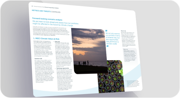23 Pension Protection Fund Climate Change Report 2021/22 METRICS AND TARGETS CONTINUED Forward-looking scenario analysis We are keen to look ahead and assess how our portfolios might be a昀昀ected in the future by climate change. To do this, we deploy a number of tools to quantify the risk posed to our Physical VaR investments and the quality of action being taken by companies. On the We have seen improvements in the following pages we pro昀椀le two tools whose application we have advanced We not only examine MSCI Climate VaR tool regarding over the past year: the MSCI Climate Value-at-Risk (CVaR) tool and the Transition physical risks and we have been Pathway Initiative (TPI) tool. We also assess what proportion of our portfolios our portfolio in terms considering these in our assessments. comprises issuers setting science-based targets for their climate action, as part The location database used by the of our e昀昀orts to start measuring our alignment. of extreme risks, but tool now maps to approximately also opportunities 270,000 locations, including an 1. MSCI Climate Value-at-Risk expansion of the global power plant that will thrive in a database. In terms of hazards, the As an asset owner, it is important for • Policy VaR tool has undergone a number of us to stress-test our portfolio and see The highest Climate VaR under Net Zero world. updates over the last year and now how its value might be impacted in a a disorderly transition is mainly covers 10 hazards across acute and chronic types17 range of scenarios and circumstances. explained by the abrupt need . To explore the impact of climate in for a higher and faster reduction our portfolio we extensively analyse in emissions. Companies would Please note one aggregate metric: Climate Value- be required to achieve a bigger Recent updates in aspects of at-Risk (‘Climate VaR’ or ‘CVaR’). emission reduction and pay a the MSCI Climate Value-at-Risk Climate VaR comprises ‘Transition VaR’ higher assumed carbon price, physical risks methodology mean (comprising Policy VaR and Technology face higher electricity costs, and it is potentially challenging to Opportunities) and ‘Physical VaR’, which absorb higher costs from value make like-for-like, year-on-year we extrapolate in our analysis. chain totalling in a higher Policy comparisons for our di昀昀erent VaR. (Conversely a failed transition asset portfolios. We look forward Transition VaR results in low Climate VaR because to showing more reliable year- We analyse Climate VaR for each of it assumes no/minimal policy action on-year progress on CVaR in our portfolios under 昀椀ve transition is taken so companies would not be future reports. scenarios, led by our Paris Disorderly, required to decarbonise as much. Paris Orderly and Failed Transition Plus they would not be forced to identi昀椀ed scenarios. For the 昀椀rst two, move into renewable energy as we decided to further split these out quickly or at all.) into a 1.5°C and a 2°C scenario after • Technology opportunities recognising that there are signi昀椀cant We not only examine our portfolio di昀昀erences in the impact even between in terms of extreme risks, but also 1.5°C and 2°C. The highest CVaR (worst) opportunities that will thrive in a is predicted to be materialised under Net Zero world. The higher policy a Paris Disorderly transition (‘1.5°C risk that our portfolio faces in a disorderly’ and ‘2°C disorderly’). The disorderly world is o昀昀set to some lowest Climate VaR (best) is predicated extent by a higher and positive under an Paris Orderly (‘1.5°C orderly’ contribution from technology and ‘2°C orderly’) or Failed Transition opportunities. Principally, the VaR (‘3°C hot house’). model assumes that, as the world moves into a Net Zero world, 17 There are now 昀椀ve acute risks and 昀椀ve companies with low-carbon chronic risks incorporated. Acute hazards patents will achieve an excellent = catastrophic events such as coastal performance as the demand for 昀氀ooding, tropical cyclones, 昀氀uvial 昀氀ooding, renewable energy/low-carbon river low 昀氀ow, wild昀椀re. Chronic hazards = technologies increases. extreme heat, extreme cold, precipitation, extreme snowfall, extreme wind.