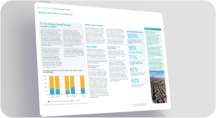 26 Pension Protection Fund Climate Change Report 2021/22 METRICS AND TARGETS CONTINUED 3. The Science-Based Targets Other asset classes CASE STUDY initiative (SBTi) We are committed to considering the In 2021, after repeated engagement Climate action plan for impacts of climate change across all from us, we also saw these managers Our Real Estate AUM in numbers US real estate assets The Science-Based Targets initiative Through engagement with our investments. We have focused 昀椀rst become PRI signatories. We continue While Europe has been generally (SBTi) is a partnership between companies directly and with our on analysing ‘Liquids’, such as Equities to encourage all our managers to ahead of the US in terms of CDP, the United Nations Global external fund managers we will and Credit, as these asset classes further elevate their ability to measure, 100% climate awareness, as well as Compact, World Resources Institute target an increase in this proportion. are the most measurable, have the collect and report data. We are pleased availability of data and tools (WRI) and the World Wide Fund for Currently our Credit book is lagging greatest depth of data (in the case of to see, for example, that physical risk for climate management, we Nature (WWF). It aims to provide its benchmark, with less than a Equities) and are where action is most assessment is a priority for all our is under transition and physical are delighted to see the work companies with a clearly-de昀椀ned 昀椀fth of market value exposure to expedient. However, we are striving to real estate managers, with progress climate risk assessment by our performed on our US real path to reduce emissions in line with issuers with SBTi commitments improve the reporting of other assets, on performing assessments and managers estate assets. the Paris Agreement goals by setting or approved targets which is likely especially in the real assets space. developing tangible plans for action. ambitious, science-based emissions due to the higher allocation to the Our US manager has conducted reduction targets. Financials sector. Real estate Measuring our real estate a robust assessment of risks, carbon footprint 95% measuring the carbon footprint This year we used a new dataset Outside of this analysis, three of our As discussed earlier in this report, We aspire to be able to measure the and thus the risk to assets being within the MSCI ESG platform Private Equity managers have also construction and buildings/real estate energy and carbon footprint of our is managed by PRI signatories stranded, as well as in-depth, to analyse what proportion of committed to science-based targets account for nearly 40 per cent of real estate assets. We have started location-based risk assessments our portfolios have exposure for private equity companies, as part energy and process-related carbon collecting data and have look-through of physical risk, quantifying the to companies that have either of the recently launched SBTi Private emissions, and therefore play a critical on the energy and carbon pro昀椀les of value at risk. committed to SBTi targets or Equity sector initiative. role in global e昀昀orts to decarbonise. individual funds. 77% had targets approved by the The consideration and assessment of On the basis of this assessment, initiative. We are pleased to see transition risks and physical risks in our However, we are not yet in a position the manager has developed a that currently around a third of Real Estate portfolio is therefore a vital to report a credible aggregated is managed by signatories to comprehensive climate action our Equities book by market value part of our RI approach. number for the overall portfolio. the Net Zero Asset Managers plan that commits it to reducing comprises companies with SBTi This is primarily due to challenges Initiative19 landlord carbon emissions by 70 commitments, which is ahead of Working with our real around tenant data transparency. per cent by 2025 and targeting our equity benchmark. estate managers Our external managers are working a more resilient portfolio with Our real estate investments are with data providers and consultants reduced climate risk exposure. Percentage of portfolio committed to SBTi or SBTi-approved targets predominantly managed externally to establish a benchmark, track 61% (by market value) so we focus on robust appointment, meaningful reductions in energy and monitoring and oversight processes develop tangible plans for action. is managed with speci昀椀c ESG 100% of our managers’ ESG and climate We welcome targeted engagement targets in place 67.7% 73.6% 82.7% 64.6% 72.9% capabilities. All of our real estate and the introduction of lease clause 80% managers now report to us annually changes (wherever jurisdictions allow) on the ESG and TCFD pro昀椀le of their to enable greater transparency around portfolios. We also use external tools tenants’ energy use. 60% such as GRESB and CRREM (Carbon 60% Risk Real Estate Monitor) to measure 40% and benchmark the performance are funds under the GRESB 32.3% 35.4% of real assets and assess the risk of survey assessment 20% 26.4% 27.1% stranded property assets. Two of our 17.3% managers have made substantial 0 progress in their disclosure and data PPF Equity PPF Credit PPF management, with one performing a Equities benchmark Credit benchmark UK Credit complete climate assessment (see US case study right). Committed to SBTi or SBTi-approved targets Rest of portfolio Certain information ©2022 MSCI ESG Research LLC. Reproduced by permission; no further distribution. 19 87 per cent is managed under a speci昀椀c strategy for Net Zero management.