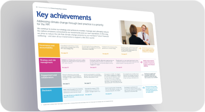 04 Pension Protection Fund Climate Change Report 2021/22 Key achievements Addressing climate change through best practice is a priority for the PPF. We continue to evolve our strategy and actions to monitor, manage and ultimately reduce the carbon emissions connected to our investments and our own operations. In this way, we strive to reduce the risk that climate change presents to our members’ future 昀椀nancial wellbeing – and steer all our investments to support a Net Zero world. Governance and Committed to developing a holistic Accepted by the Financial Reporting Introduced new company voting Reported climate-related risks through Created clear commitment accountability sustainability strategy as part of the Council (FRC) as a signatory to the UK guidelines for climate change monthly dashboards to our CIO and to and oversight of action to PPF’s new Strategic Plan Stewardship Code 2020 through quarterly dashboards to our reduce climate-related risks Investment Committee on behalf of our members See page 09 See page 09 See page 07 Strategy and risk Updated our climate policy and tools to re昀氀ect Conducted a Net Zero alignment project across our Transitioned to our new equity benchmark to drive Acted to reduce exposure management scenarios for global action to limit warming to complete portfolio to assess our alignment with a signi昀椀cant reduction in the carbon exposure of our to climate risks across our 1.5°C rather than 2°C the Paris Agreement and identify highest priority equity mandates, especially passive ones portfolios to safeguard our engagement targets members’ future 昀椀nancial wellbeing See page 10 See page 12 See page 16 Engagement and Helped to develop a cross-body Actively participated in a working Participated in CA100+, the biggest- Encouraged to see a number of our Continued to support and collaboration industry-standard TCFD template for group for the newly launched IIGCC ever investor engagement initiative external fund managers joining the encourage industry best managers to report carbon emissions Net Zero Stewardship Toolkit to which we are a signatory, which Net Zero Asset Managers initiative – practice to protect the long- to clients saw over 50 per cent of targeted 25 per cent have committed so far term interests of our members companies committing to Net Zero and nearly 75 per cent aligning their See page 11 See page 15 disclosures with TCFD during the year Disclosure Began reporting against the Greening Expanded the range of TCFD- Started requiring basic climate data Shortlisted for the Pensions for Ensured we share as deep Government Commitments on our related metrics on which our from our Alternatives managers and Purpose Paris Aligned Awards for the an insight as possible of the 1 operational environmental impact Liquids managers report to us introduced key ESG risk analysis Best Climate Governance and Strategy climate exposures we face Statement in November 2021 to provide transparency for See page 30 and our 2021/22 Annual See page 10 See page 10 our stakeholders Report & Accounts 1 ‘Liquids’ refers to Global Credit, Public Equity, Absolute Return, Emerging Market Debt and Strategic Cash. All of these, apart from Strategic Cash, are managed externally.