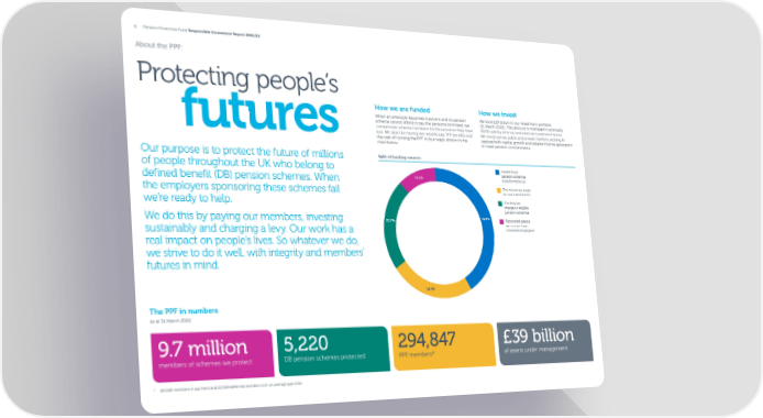 1 Pension Protection Fund Responsible Investment Report 2021/22 About the PPF: Protecting people’s How we are funded How we invest When an employer becomes insolvent and its pension We hold £39 billion in our investment portfolio scheme cannot a昀昀ord to pay the pensions promised, we (31 March 2022). This amount is managed in a broadly compensate scheme members for the pensions they have 50/50 split by internal and external investment teams. futures lost. We raise the money we need to pay PPF bene昀椀ts and We invest across public and private markets, seeking to the cost of running the PPF in four ways, shown in the capture both capital growth and reliable income generation chart below. to meet pension commitments. Our purpose is to protect the future of millions Split of funding sources of people throughout the UK who belong to Assets from pension schemes de昀椀ned bene昀椀t (DB) pension schemes. When 11.2% transferred to us The return we make the employers sponsoring these schemes fail on our investments we’re ready to help. The levy we charge on eligible pension schemes We do this by paying our members, investing 22.7% 42.1% Recovered assets we secure from sustainably and charging a levy. Our work has a insolvent employers real impact on people’s lives. So whatever we do, we strive to do it well, with integrity and members’ futures in mind. 24.0% The PPF in numbers as at 31 March 2022 9.7 million 5,220 294,847 £39 billion members of schemes we protect DB pension schemes protected PPF members* of assets under management * 187,039 members in payment and 107,808 deferred members with an average age of 66.