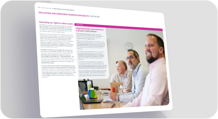 32 Pension Protection Fund Responsible Investment Report 2021/22 ESCALATION AND EXERCISING SHAREHOLDER RIGHTS CONTINUED Exercising our rights in other assets CASE STUDY Our rights as a provider of 昀椀xed income debt to a company di昀昀er markedly from those as a shareholder. We 昀椀nd that Negotiating best governance as achieving large-scale change among 昀椀xed income issuers a private credit investor can often be more e昀昀ectively managed through industry- led initiatives rather than as a single investor. PPF funded the development of 155 new social However, we have developed a fully integrated approach to housing units in a London borough. The investment the assessment and oversight of our potential and ongoing will be serviced by securitised lease payments 昀椀xed income investments. As an example, in UK private ringfenced within a legal structure. credit, where data can be less readily available, we rely We set out to simplify what was a complex structure heavily on our internal due diligence process. This involves by delineating responsibilities to ensure all foreseeable signi昀椀cant engagement with management of private risks were addressed in a timely way. In particular, we companies. ESG considerations, in addition to commercial were keen to ensure that the local authority backing and risk-related analysis, are evaluated and concerns are this deal was set up contractually as the ultimate addressed within the process. safety net. Ultimately, if we are not comfortable with the terms of a To achieve rating parity between the structure and deal, we will not participate. However, we will often seek the sponsoring local authority, we ensured that to propose amendments to the terms of the agreement construction risk was removed from our transaction and ensure that any additional requests we have are and debt service payments bene昀椀ted from statutory incorporated into the deal and – where appropriate – the protections available to traditional borrowing in future structure of the company. As part of the ongoing that sector. management of 昀椀xed income assets, we will often continue to seek positive change once entering into an agreement Construction risk was addressed by establishing (see case study, right). a risk control framework. This included 昀椀xed cost In private market closed-ended funds managed externally, contracting, contractual guarantees to the constructor we have found that it is almost impossible to retrospectively from its ultimate parent, insurance protection and, if all change any contracts or side letter terms that were signed else fails, the council standing as ultimate guarantor. historically. Therefore, we look to obtain su昀케cient recourse Key to our investment thesis was the self-supportive in our side letters, so that if we determine that we no longer nature of the asset. This was deemed important to wish to remain invested in a portfolio company due to mitigate reputational risk and ensure the collateral an unmitigable risk, we have the option to transfer out of can provide meaningful protection enhancement. the fund.