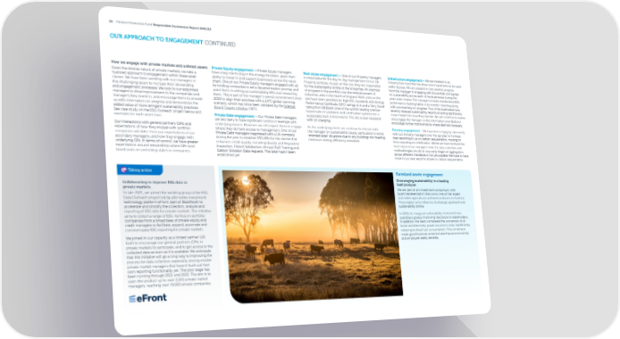 21 Pension Protection Fund Responsible Investment Report 2021/22 OUR APPROACH TO ENGAGEMENT CONTINUED How we engage with private markets and unlisted assets Private Equity engagement – Private Equity managers Real estate engagement – One of our Property managers Infrastructure engagement – We are invested in an Given the diverse nature of private markets, we take a have a key role to play in the energy transition, given their is responsible for the day-to-day management of our UK Infrastructure fund that has three core investments all focused nuanced approach to engagement within these asset ability to invest in and support businesses across the value Property portfolio. As part of this role, they are responsible within Europe. We are pleased to note positive progress classes. We have been working with our managers in chain. One of our Private Equity managers engaged with all for the sustainability pro昀椀le of the properties. An example from the manager in engaging with its portfolio companies this challenging space to increase their stewardship its holding companies to set a decarbonisation journey and of progress in the portfolio was the redevelopment of on sustainability across each of the businesses during the and engagement processes. We look to our appointed assist them in setting up sustainability KPIs and measuring industrial units in the North of England. Both units on the year under review. The manager provides standardised ESG managers to drive improvement in the companies and them. This is part of the manager’s overall commitment since site have been speci昀椀ed for high ESG standards with Energy performance tracking tables in its investor reporting along managers they invest in, and encourage them to provide 2020 to align their activities with a 1.5°C global warming Performance Certi昀椀cate (EPC) ratings of A and a ‘Very Good’ with commentary on progress. Two of the businesses have us with information on progress and demonstrate the scenario, which has since been validated by the Science rating from BREEAM (one of the world’s leading science- recently released sustainability reports providing signi昀椀cantly added value of more stringent sustainability practices. Based Targets initiative (SBTi). based suite of validation and certi昀椀cation systems for a more insight into how they operate. We will continue to review See case study on the ESG Outreach project below and Private Debt engagement – Our Private Debt managers sustainable built environment). The site is also equipped and engage the manager on the information provided and examples for each asset class. with EV charging. encourage further improvements where deemed necessary. are less likely to have signi昀椀cant control or leverage with Our interactions with general partners (GPs) and underlying issuers. However, we still expect them to engage As the underlying client, we continue to interact with Forestry engagement – We have been engaging extensively expectations of how they engage with portfolio where they do have access to management. One of our the manager on sustainability issues, particularly to avoid with our Forestry managers over the last year to increase companies will di昀昀er from our expectations of our Private Debt managers negotiated with a UK company ‘stranded asset’ situations due to any buildings not meeting their reporting to us on carbon sequestration, moving on secondary managers, and how they engage with during the year to establish ESG KPIs for the ratchet that minimum energy e昀케ciency standards. from reporting on certi昀椀cation. Whilst we have received this underlying GPs. In terms of control, we have greater enhances credit quality, including Quality and Regulatory from most of our managers now, the data collection and expectations around stewardship where GPs hold Inspection, Patient Satisfaction, Annual Sta昀昀 Training and methodologies are still at very early stages so aggregation board seats or controlling stakes in companies. Carbon Emission Data requests. The latter hasn’t been across di昀昀erent mandates is not yet possible. We hope to have established yet. more in our next report to share on carbon sequestration. Taking action Farmland assets engagement Encouraging sustainability in a leading Collaborating to improve ESG data in beef producer private markets We are part of an investment consortium with In late-2021, we joined the working group of the ESG board representation that owns one of the largest Data Outreach project led by alternative investment and oldest agricultural and beef producers in Australia. technology platform eFront (part of BlackRock) to This enables us to in昀氀uence its strategic approach and accelerate and simplify the collection, analysis and sustainability pro昀椀le. reporting of ESG data for private markets. The initiative aims to collect a range of ESG metrics on portfolio In 2021, its inaugural sustainability framework was companies from a broad base of private equity and published, greatly improving disclosure to stakeholders. credit managers to facilitate, expand, automate and In addition, the team completed the conversion of all commercialise ESG reporting for private markets. bores and electricity power sources to solar, signi昀椀cantly reducing its fossil fuel consumption. This conversion We joined in our capacity as a limited partner (LP) made good business sense but also has environmental both to encourage our general partners (GPs) in and employee safety bene昀椀ts. private markets to participate, and to get access to the collected data as soon as it is available. We anticipate that this initiative will go a long way to improving the process for data collection, especially among smaller private market managers that haven’t built out their own reporting functionality yet. The pilot stage has been running through 2021 and 2022. The aim is to open the product up to over 2,500 private mark