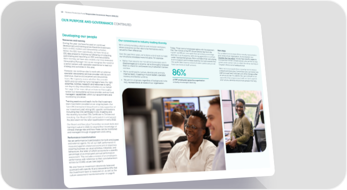 12 Pension Protection Fund Responsible Investment Report 2021/22 OUR PURPOSE AND GOVERNANCE CONTINUED Developing our people Our commitment to industry-leading diversity Resources and training We’re actively building a diverse and inclusive workplace, During the year, we have focused on continual Today, 79 per cent of employees agree with the statement Next steps: development and training across the entire Investment where everyone can feel able to be themselves and is that, ‘the culture at the PPF allows people like me to be Our ambition is to increase ethnic minority representation team on ESG matters and stewardship activities. valued for their di昀昀erences. myself’ and 86 per cent agree that we actively encourage at all levels of our organisation. As we shared in our Within the ESG team speci昀椀cally, we have hired an Over the past three years, we’ve done a lot of work to make diversity in all its aspects, with strong agreement in certain Diversity Pay Gap report, we also have speci昀椀c targets to ESG data analyst to improve our e昀케ciency of collecting, our structural processes more inclusive. For example: under-represented groups. We’re con昀椀dent that we’re doing increase the number of black people who we hire as new assimilating and reporting on ESG and stewardship. a lot to support and increase diversity, but we’re aware that joiners and in senior roles, to re昀氀ect the ethnic diversity of More recently, we have also created a full-time dedicated • Rather than assume our recruitment processes aren’t this work takes time to come to fruition, particularly as we Croydon where we’re headquartered. Stewardship Manager role as we recognise the need for disadvantageous to anyone, we’ve thoroughly reviewed have low levels of sta昀昀 turnover. a senior person with specialist experience to lead our them to check for and prevent any inadvertent barriers While we’ve increased ethnic minority representation strategy and activities in this area. and bias at Board and Executive Committee level, our overall low sta昀昀 turnover hasn’t allowed us to drive change as fast However, we continue also to work with an external • We’ve continued to nurture, develop and promote 86% as we would like. To address this, we continue to run specialist stewardship services provider with its own internal talent, investing in future leaders, specialist apprenticeship programmes, build our talent pipeline extensive, diverse and experienced stewardship training and 昀氀exible working and nurture, develop and promote people internally. • We aim for all groups, regardless of background, to be of PPF employees agree the organisation team. We regularly assess whether this provider actively encourages diversity (EOS) and our external fund managers have the right fully represented at all levels of our organisation. expertise, policies, research and resources to carry out day-to-day stewardship activities on our behalf. See page 17 for more detail on how we thoroughly review our stewardship services provider and our fund managers’ capabilities within our appointment and monitoring processes. Training sessions and teach-ins for the Investment team have been provided on an ongoing basis. Our Talent & Development department is fully supportive of our investment sta昀昀 sitting ESG-speci昀椀c certi昀椀cations including the CFA Certi昀椀cate in ESG Investing and the recently-launched CFA Certi昀椀cate in Climate and Investing. Our Head of ESG participated in and passed the pilot exam for the latter quali昀椀cation in early 2022. Our Board and Executive Committee received dedicated training in autumn 2021 to expand their knowledge of climate change risks and how these can be monitored and managed through engagement and voting. Performance incentivisation We set performance incentivisation for both employees and external agents. For all our sta昀昀, performance is measured against a balanced scorecard of objectives covering business-as-usual activities, initiatives, and behaviours, the latter of which accounts for a speci昀椀c percentage of an employee’s annual performance assessment. This includes a review of an employee’s performance with reference to their core behaviours across our ICARE values (see page 8). We also have an investment directorate balanced scorecard with speci昀椀c RI and stewardship KPIs that the Investment team is measured on, as well as the culture assessment mentioned earlier on page 8.