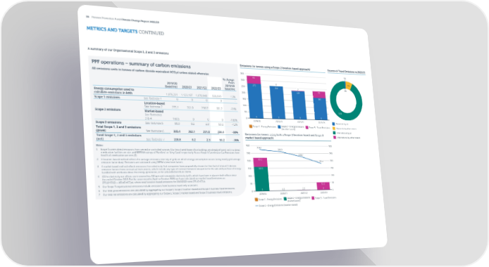 35 Pension Protection Fund Climate Change Report 2022/23 METRICS AND TARGETS CONTINUED A summary of our Organisational Scope 1, 2 and 3 emissions Emissions (in tonnes using a Scope 2 location-based approach) Sources of Travel Emissions in 2022/23 PPF operations – summary of carbon emissions 350 1% All emissions units in tonnes of carbon dioxide equivalent (tCO e) unless stated otherwise 2 60 % change 300 7% from 275 0 2019/20 2019/20 250 262 2 0% (baseline) 2020/21 2021/22 2022/23 baseline 229 53 200 Energy consumption used to 181 calculate emissions in kWh 1,076,231 1,123,197 1,076,948 936,935 -13% 150 Scope 1 emissions See footnote 1 0 0 0 0 – Location-based 100 See footnote 2 275.1 261.9 228.7 181.2 -34% 50 92% Scope 2 emissions Market-based 0 0 0 0 See footnotes 0 3 & 4 160.5 0 0 0 -100% 2019/20 2020/21 2021/22 2022/23 Domestic by air Scope 3 emissions See footnote 5 60.3 0.2 2.3 53.2 -12% Scope 1 – Energy Emissions Scope 2 – Energy Emissions Scope 3 – Travel Emissions Domestic by other means (location-based) Total Scope 1, 2 and 3 emissions International by air (gross) See footnote 6 335.4 262.1 231.0 234.4 -30% Emissions (in tonnes using both a Scope 2 location-based and Scope 2 International by other means Total Scope 1, 2 and 3 emissions market-based approach) (net) See footnote 7 220.8 0.2 2.3 53.2 -76% Notes: 300 275.1 300 1 Scope 1 covers direct emissions from owned or controlled sources. Our two shared-lease o昀케ce buildings are already e昀케cient, with no direct 261.9 combustion facilities on-site, and BREEAM ratings of ‘Excellent’ or ‘Very Good’ respectively. So our Scope 1 Greenhouse Gas Emissions from 250 228.7 250 fossil fuel combustion are zero (0). 2 A location-based method re昀氀ects the average emissions intensity of grids on which energy consumption occurs (using mostly grid-average 200 60.3 181.2 200 emission factor data). Emissions are calculated using DEFRA conversion factors. 3 A market-based method re昀氀ects emissions from electricity that companies have purposefully chosen (or their lack of choice). It derives emission factors from contractual instruments, which include any type of contract between two parties for the sale and purchase of energy 150 160.5 150 bundled with attributes about the energy generation, or for unbundled attribute claims. 4 All the electricity our o昀케ces use is sourced via 100 per cent renewable electricity tari昀昀s, which have been in place in both o昀케ces since 100 100 the end of October 2019. For the seven months (April to October 2019) we have calculated our market-based emissions as: 275.10*(7/12) = 160.48 (tCO e), where total location-based emissions for 2019/2020 were 275.10 tCO e. 2 2 5 Our Scope 3 organisational emissions include emissions from business travel only at present. 50 53.2 50 6 Our total gross emissions are calculated by aggregating our Scope 1, Scope 2 location-based and Scope 3 business travel emissions. 0 0.2 2.3 0 7 Our total net emissions are calculated by aggregating our Scope 1, Scope 2 market-based and Scope 3 business travel emissions. 0 0 2019/20 2020/21 2021/22 2022/23 Scope 1 – Energy Emissions Scope 2 – Energy Emissions Scope 3 – Travel Emissions (market-based) Scope 2 – Energy Emissions (location-based)
