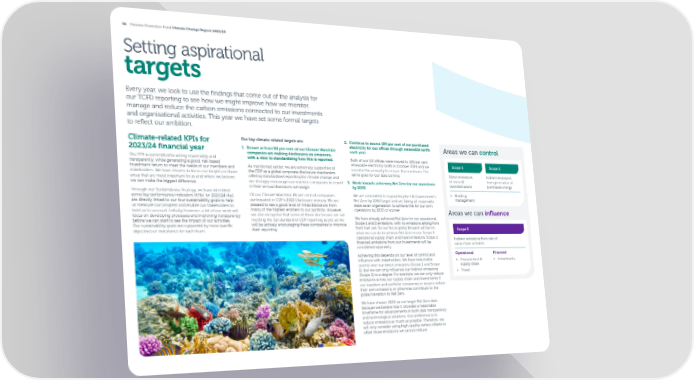 36 Pension Protection Fund Climate Change Report 2022/23 Setting aspirational targets Every year, we look to use the 昀椀ndings that come out of the analysis for our TCFD reporting to see how we might improve how we monitor, manage and reduce the carbon emissions connected to our investments and organisational activities. This year we have set some formal targets to re昀氀ect our ambition. Climate-related KPIs for Our key climate-related targets are: 2. Continue t o source 100 per cent of our purchased 1. Ensur e at least 80 per cent of our Climate Watchlist electricity for our o昀케ces through renewable tari昀昀s Areas we can control 2023/24 昀椀nancial year companies are making disclosures on emissions, each year. The PPF is committed to acting responsibly and with a view to standardising how this is reported. Bot h of our UK o昀케ces were moved to 100 per cent transparently, while generating a good, risk-based renewable electricity tari昀昀s in October 2019 and we Scope 1 Scope 2 investment return to meet the needs of our members and As mentioned ear lier, we are extremely supportive of monitor this annually to ensure this continues. The stakeholders. We have chosen to focus our targets on those the CDP as a global corporate disclosure mechanism same goes for our data centres. Direct emissions Indirect emissions areas that are most important to us and where we believe o昀昀ering standardised reporting for climate change and of owned/ from generation of we can make the biggest di昀昀erence. we strongly encourage our investee companies to report 3. W ork towards achieving Net Zero for our operations operated assets purchased energy in their annual disclosure campaign. by 2035. Through our Sustainability Strategy, we have identi昀椀ed • Building some key performance indicators (KPIs) for 2023/24 that Of our Climat e Watchlist, 84 per cent of companies W e are committed to supporting the UK Government’s are directly linked to our four sustainability goals to help participated in CDP’s 2022 Disclosure process. We are Net Zero by 2050 target and are taking all reasonable management us measure our progress and enable our stakeholders to pleased to see a good level of initial disclosure from steps as an organisation to achieve this for our own hold us to account. Initially, however, a lot of our work will many of the highest emitters in our portfolio. However, operations by 2035 or sooner. Areas we can in昀氀uence focus on developing processes and improving transparency we also recognise that some of these disclosures are not before we can start to see the impact of our activities. meeting the full standard of CDP reporting as yet, so we W e have already achieved Net Zero for our operational Our sustainability goals are supported by more speci昀椀c will be actively encouraging these companies to improve Scope 1 and 2 emissions, with no emissions arising from objectives or milestones for each team. their reporting. fossil fuel use. So our focus going forward will be on Scope 3 what we can do to achieve Net Zero in our Scope 3 operational supply chain and travel emissions. Scope 3 Indirect emissions from rest of 昀椀nanced emissions from our Investments will be value chain activities considered separately. Ac hieving this depends on our level of control and Operational Financed in昀氀uence with stakeholders. We have reasonable • Procurement & • Investments control over our direct emissions (Scope 1 and Scope supply chain 2), but we can only in昀氀uence our indirect emissions • Travel (Scope 3) to a degree. For example, we can only reduce emissions across our supply chain and investments if our suppliers and portfolio companies or issuers reduce their own emissions or otherwise contribute to the global transition to Net Zero. W e have chosen 2035 as our target Net Zero date because we believe that it provides a reasonable timeframe for advancements in both data transparency and technological solutions. Our preference is to reduce emissions as much as possible. Therefore, we will only consider using high-quality carbon o昀昀sets to o昀昀set those emissions we cannot reduce.