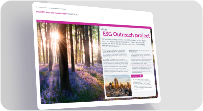 18 Pension Protection Fund Climate Change Report 2022/23 STRATEGY AND RISK MANAGEMENT CONTINUED CASE STUDY eFront ESG Outreach project We have been closely involved in an ESG outreach project led by one of our data solution providers eFront (part of BlackRock) to address the lack of ESG and climate-related data and reporting from private companies. We joined the eFront ESG Outreach pilot project as In terms of emissions data reported for the PPF a limited partner (LP) in late-2021, working with a funds in the pilot: selection of private equity and credit general partners (GPs) managing funds with vintage years from 2015 to • 37 per cent of our portfolio companies reported collect relevant ESG and climate metrics on underlying GHG emissions data, of which just over half was portfolio companies. actual rather than estimated data We anticipate this initiative will go a long way to • The frequency of Scope 1 and 2 emissions disclosure improving the process for private market data collection, was much higher than Scope 3; only 25 per cent especially among smaller managers that haven’t yet built of companies reported on Scope 3 whether actual out their own reporting functionality. The ultimate aim or estimated (similar to public markets) is to open the product up to over 2,500 private market • eFront was also able to o昀昀er LPs the option to 昀椀ll managers, reaching over 70,000 private companies. some data gaps with higher-level sector estimates; With our encouragement, 60 per cent of our own as a result, emissions data (whether actual or managers that were contacted in the pilot phase reported estimated) was available for just over 90 per portfolio company data – four times higher than the cent of our portfolio companies in the funds that overall response rate. responded to the pilot. Next steps The 2023 update has been signi昀椀cantly expanded across the eFront platform and increased eightfold for PPF’s GPs. As part of the broader roll-out this year, it has been recognised that more education is needed among GPs to raise awareness of the regulation that LPs face in di昀昀erent jurisdictions and the timeframes for reporting.