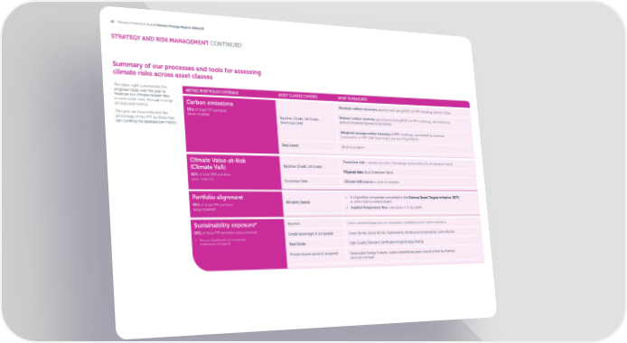 15 Pension Protection Fund Climate Change Report 2022/23 STRATEGY AND RISK MANAGEMENT CONTINUED Summary of our processes and tools for assessing climate risks across asset classes The table, right, summarises the METRIC/PORTFOLIO COVERAGE ASSET CLASSES COVERED WHAT IS MEASURED progress made over the year to measure our climate-related risks in each asset class, through a range Absolute carbon emissions apportioned (using EVIC) to PPF’s holdings (tonnes CO e) Carbon emissions 2 of tools and metrics. 55% of total PPF portfolio This year we have indicated the value covered Equities, Credit, UK Credit, Relative carbon intensity apportioned (using EVIC) to PPF’s holdings, normalised by percentage of the PPF portfolio that Sovereign Debt amount invested (tonnes CO2e/USDm) can currently be assessed per metric. Weighted average carbon intensity of PPF’s holdings, normalised by revenues (corporates) or PPP-GDP (sovereign), (tonnes CO2e/USDm) Real Assets Work in progress Climate Value-at-Risk Transition risks – policy risk costs, technology opportunities (% of Enterprise Value) (Climate VaR) Equities, Credit, UK Credit Physical risks (% of Enterprise Value) 55% of total PPF portfolio value covered Sovereign Debt Climate VaR metrics – work in progress Portfolio alignment • % of portfolio companies committed to the Science Based Targets initiative (SBTi) 95% of total PPF portfolio All asset classes or other science-based targets value covered • Implied Temperature Rise, expressed in °C (by 2100) Sustainability exposure* Equities Green revenues/exposure to companies classi昀椀ed as low-carbon solutions 63% of total PPF portfolio value covered Credit (sovereign & corporate) Green Bonds, Social Bonds, Sustainability Bonds and Sustainability Linked Bonds * See our classi昀椀cation of ‘sustainable’ investments on page 33. Real Estate High Quality Standard Certi昀椀cation/High Energy Rating Private Assets (work in progress) Renewable Energy, Forestry, assets classi昀椀ed as green opportunities by internal/ external manager