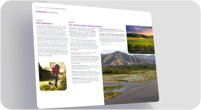40 Pension Protection Fund Climate Change Report 2022/23 APPENDICES CONTINUED Appendix E Appendix F MSCI disclaimer Our climate change voting guidelines This disclosure was developed using information from MSCI Climate change is a key area of focus for us, and Net Zero Climate-related Shareholder Proposals: For European ESG Research LLC or its a昀케liates or information providers. stewardship is a fundamental part of our approach to companies, we will be reviewing any shareholder proposals Although the Pension Protection Fund’s information management of climate-related risks. Read our Climate related to climate change internally. providers, including without limitation, MSCI ESG Research Change Policy for more details. Through our stewardship Companies on the PPF’s Climate Engagement Watchlist: LLC and its a昀케liates (the ‘ESG Parties’), obtain information provider and participation in collaborative initiatives, we (the ‘Information’) from sources they consider reliable, none expect tangible progress around Net Zero and work with Shareholder meetings at companies on our Climate Watchlist of the ESG Parties warrants or guarantees the originality, both our managers and companies to encourage the will also be reviewed internally by the ESG Team. This accuracy and/or completeness, of any data herein and transition to a low-carbon economy. process will allow additional analysis around the progress expressly disclaim all express or implied warranties, including being made against our internally-set targets. A vote against those of merchantability and 昀椀tness for a particular purpose. In order to measurably track and encourage progress on management may be necessary if we consider there has The Information may only be used for your internal use, may climate, we utilise the management quality assessment of been inadequate progress. not be reproduced or redisseminated in any form and may companies by the Transition Pathway Initiative (TPI). We (Last reviewed March 2023.) not be used as a basis for, or a component of, any 昀椀nancial are also informed by the Climate Action 100+ Net Zero instruments or products or indices. Further, none of the Benchmark for those companies included in this assessment. Information can in and of itself be used to determine which We also will be guided in our voting by the industry initiatives securities to buy or sell or when to buy or sell them. None around Net Zero alignment for both asset owners and our of the ESG Parties shall have any liability for any errors or asset managers. omissions in connection with any data herein, or any liability For 2023, we have increased the thresholds for climate- for any direct, indirect, special, punitive, consequential or any related voting guidelines as noted below: other damages (including lost pro昀椀ts) even if noti昀椀ed of the possibility of such damages. Transition Pathway Initiative Management Quality score: All European and Australian companies in all sectors below Level 4; all coal, oil, gas, utilities and automotive companies below Level 4 vs. Level 3 for autos in 2022; below Level 3 for all remaining sectors/companies in US and Asia and Emerging Markets; Climate Action 100+ Benchmark: Companies that have no medium-term targets in place as identi昀椀ed by indicator 3 of the Climate Action 100+ Benchmark; Coal: Companies identi昀椀ed as expanding coal-昀椀red infrastructure by the Global Coal Exit List or companies that have signi昀椀cant dependence on coal without a su昀케ciently ambitious timeline and strategy for coal phaseout; and Deforestation: Companies that score below 10 on the Forest 500 ranking (assesses companies’ disclosure and management of deforestation risks); Financial institutions that score 0 on the Forest 500 ranking.