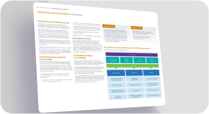 09 Pension Protection Fund Climate Change Report 2022/23 GOVERNANCE AND ACCOUNTABILITY CONTINUED Climate and sustainability training • Climate Action 100+ Net Zero Benchmark constituents where companies have no medium-term targets in place Board ESG credentials Next steps A key governance aim this year was to build internal • Companies expanding coal-昀椀red infrastructure or that knowledge and understanding at the PPF of sustainability, have signi昀椀cant dependence on coal without a su昀케ciently The composition of the PPF Board has always Further training will include improving carbon and especially climate, issues through training and education. ambitious timeline and strategy for coal phase-out been crucial in stewarding value creation while literacy for PPF employees more widely, and a deep Two external speakers were invited to speak to the PPF • For deforestation, companies that score low on the also managing ESG risks. We have a Board member dive on o昀昀setting carbon emissions. Board about their experience and insights, followed by a Forest 500 rankings. with particular ESG expertise, who is also one of panel discussion and Q&A. One speaker gave an overview the members of our Sustainability Strategy Group. We will de昀椀ne more interim targets for the See Appendix F Sustainability Strategy and move into an from a non-昀椀nancial services perspective and the other for our full voting guidelines policy update. The PPF Board is proactive and regularly updated focused on how a listed asset manager is approaching by the ESG & Sustainability Team on the latest implementation phase. sustainability and its commitment to supporting Net Zero. In-house additional review process developments and thinking in ESG, sustainability For UK and other European companies, we now review and climate risk management. A Board strategy away-day included deep-dive interactive any shareholder proposals related to climate change workshops covering ESG materiality assessments, Net Zero internally. Shareholder meetings at companies on our target setting, and communicating sustainability issues to Climate Watchlist are also reviewed internally by the ESG & all stakeholders. Sustainability Team. Both steps will allow additional analysis Our approach to Responsible Investment (RI) and stewardship Upskilling of the Investment team on climate has continued around the progress being made against our internally-set throughout the year. The ESG team presented the results targets. A vote against management may be necessary if Our RI framework puts our core beliefs into practice: of the Paris Portfolio Alignment Project, including baseline we consider there has been inadequate progress on climate and subsequent progress. Executive Committee and Board strategy and management. members were also invited to attend. RI Framework Sustainability Strategy Enhancing voting guidelines accountability Strategic and oversight Governance & direction Risk Metrics & This year saw the publication of the PPF Sustainability accountability & policy management transparency In order to measurably track and encourage progress on Strategy, another critical development to help ensure the climate action, we use the Transition Pathway Initiative’s Fund’s longevity, enable us to lead by example and catalyse Management Quality assessment of companies (TPIMQ). the growth of a more sustainable pensions industry. Priorities We are also informed by the Climate Action 100+ Net Zero The Sustainability Strategy is a result of collaborative e昀昀orts, Company Benchmark and guided in our voting by industry starting at PPF Board level and cascading down to internal initiatives around Net Zero alignment for both asset owners Sustainability Working Groups. We have established a and our asset managers. clear line of leadership and accountability for developing, For 2023 voting decisions, we increased the TPIMQ delivering and evaluating the strategy. Climate Change Stewardship Reporting score thresholds for climate-related voting guidelines, This gives the PPF Board ultimate oversight with the authority particularly for: to approve and amend the strategy as deemed necessary. • European and Australian companies in speci昀椀c sectors As detailed in the panel on page 07, a Sustainability Strategy Climate & sustainability Engaging with (coal, oil, gas, utilities and autos) Group (SSG) has been created to steer development of the policies & strategies fund managers Internal ESG dashboards strategy and de昀椀ne what success looks like. Climate stewardship Engaging with issuers Investment Committee & Board reporting Climate risk assessments Voting of shares External RI reporting & sustainability reporting Climate Collaborative engagement External climate reporting opportunities & public policy