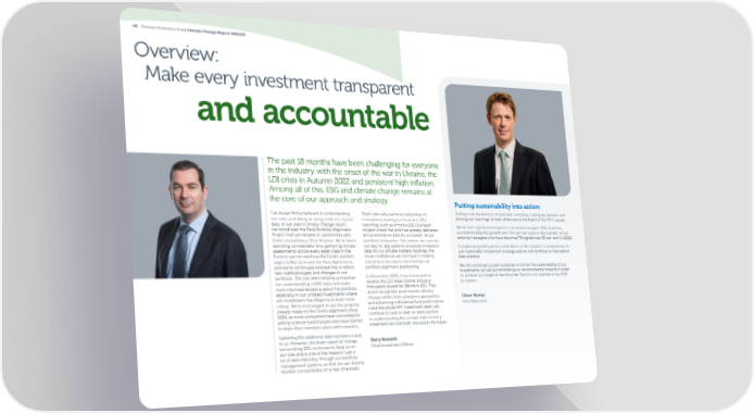 05 Pension Protection Fund Climate Change Report 2022/23 Overview: Make every investment transparent and accountable The past 18 months have been challenging for everyone in the industry, with the onset of the war in Ukraine, the LDI crisis in Autumn 2022 and persistent high in昀氀ation. Among all of this, ESG and climate change remains at the core of our approach and strategy. Putting sustainability into action I’ve always 昀椀rmly believed in understanding That’s also why we’re so supportive of Setting new standards in responsible investing, leading by example and our risks, and doing so using evidence-based innovations looking to streamline ESG sharing our learnings to help others are at the heart of the PPF’s values. data. In last year’s Climate Change report, reporting, such as eFront’s ESG Outreach We’ve seen signi昀椀cant progress in our fund managers’ ESG practices, we introduced the Paris Portfolio Alignment project where the pilot has already delivered as evidenced by the growth over the last few years in the number of our Project that we initiated in partnership with actual emissions data for a number of our external managers who have become PRI signatories (90 per cent in 2022). Dutch consultancy Ortec Finance. We’ve been portfolio companies. The sooner we can use spending considerable time gathering climate our day-to-day systems to access emissions Collaborating with partners and others in the industry is fundamental to assessments across every asset class in the data for our private markets holdings, the our responsible investment strategy and we will continue to help de昀椀ne Fund so we can see how the Fund’s position more con昀椀dence we can have in making best practice. aligns to Net Zero and the Paris Agreement, investment decisions informed by our and we’ve continually evolved this to re昀氀ect portfolio alignment positioning. We will continue to push ourselves to further the sustainability of our new methodologies and changes in our investments, as well as minimising our environmental impacts in order portfolios. This has been helping us improve In December 2022, I was honoured to to achieve our target of reaching Net Zero for our operations by 2035 our understanding of ESG data and make receive the CIO Asset Owner Industry or sooner. more informed decisions about the portfolio, Innovation Award for E昀昀orts in ESG. This especially in our unlisted investments where award recognises asset owners driving pre-investment due diligence is even more change within their allocation approaches Oliver Morley critical. We’re encouraged to see the progress and enhancing institutional fund performance. Chief Executive already made on the Fund’s alignment since I and the whole PPF investment team will 2020, as more companies have committed to continue to look to lead on best practice setting science-based targets and have started in understanding the climate risks of every to share their transition plans with investors. investment we hold both now and in the future. Gathering this additional data has been crucial to us. However, the sheer speed of change Barry Kenneth surrounding ESG continues to keep us on Chief Investment O昀케cer our toes and is one of the reasons I use a lot of data internally, through our portfolio management systems, so that we can directly monitor our portfolios on a real-time basis.