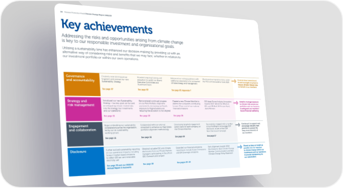 04 Pension Protection Fund Climate Change Report 2022/23 Key achievements Addressing the risks and opportunities arising from climate change is key to our responsible investment and organisational goals. Utilising a sustainability lens has enhanced our decision-making by providing us with an alternative way of considering risks and bene昀椀ts that we may face, whether in relation to our investment portfolio or within our own operations. Governance Created a new steering group Provided ongoing training and Enhanced our voting guidelines with Maintained our signatory status under Created clear commitment and accountability to govern and oversee our new education to upskill our Board, additional expectations for companies’ the FRC’s UK Stewardship Code 2020 to and oversight of action to Sustainability Strategy Executive Committee and climate strategy and management reduce climate-related risks Investment team on behalf of our members See page 07 See page 09 See page 09, Appendix F Strategy and Introduced our new Sustainability Demonstrated continued progress Created a new Climate Watchlist to CIO Asset Owner Industry Innovation Acted to manage exposure risk management Strategy – two key goals are focused on our Paris Portfolio Alignment address the companies contributing Awards 2022: Winner for E昀昀orts in to climate risks across our on integrating climate-related risks assessments, increasing our Fund’s to over 70 per cent of our material ESG and IPE Best UK Pension Fund; portfolios and our business into the strategy (our investments exposure to Aligned assets and 昀椀nanced emissions Joint Winners to safeguard our members’ and our operations) reducing the allocation to Not Aligned future 昀椀nancial wellbeing See page 11 See page 13 See page 16 Engagement Began embedding our sustainability Collaborated with our external Developing targeted engagement Successfully engaged with a number Continued to support and and collaboration considerations across the organisation, consultant to enhance our Real Estate action plans for each company on of our holdings to encourage CDP encourage industry best led by our six sustainability portfolio’s alignment methodology the Climate Watchlist disclosure, as part of the CDP practice to protect the working groups Non-Disclosure Campaign long-term interests of our members See page 11 See page 32 See page 16 See page 17 Disclosure Further evolved sustainability reporting Obtained valuable ESG and climate Expanded our 昀椀nanced emissions Paris Alignment Awards 2022: Shared as deep an insight as on our operational impacts, including disclosures from our Private Markets reporting to include Scope 3 emissions Shortlisted for Best Climate Change possible into our exposure Scope 2 market-based emissions managers participating in the eFront and EM sovereign emissions Member Communication and Best to climate change within our to re昀氀ect 100 per cent renewable ESG Outreach pilot project Climate Change Policy Statement investments and our operations electricity use to provide transparency for our stakeholders See page 35 and our 2022/23 See page 18 See pages 23–24 Annual Report & Accounts