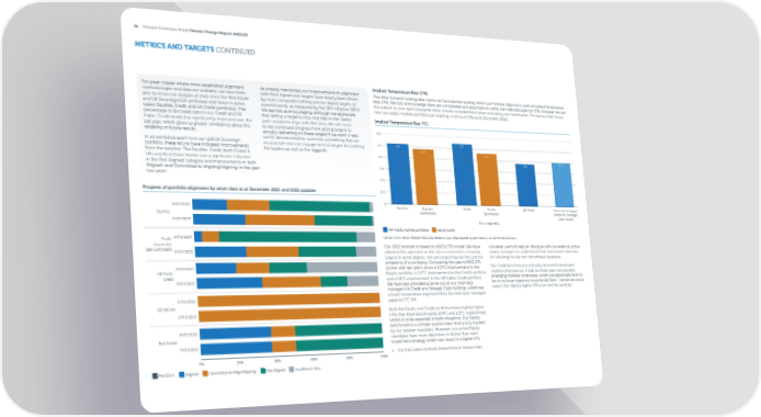31 Pension Protection Fund Climate Change Report 2022/23 METRICS AND TARGETS CONTINUED Implied Temperature Rise (ITR) For asset classes where more established alignment As already mentioned, our improvements in alignment The other forward-looking data metric we have started tracking within our Portfolio Alignment work is Implied Temperature methodologies and data are available, we have been with Paris Agreement targets have largely been driven Rise (ITR). We fully acknowledge there are complexities and assumptions within the methodologies for ITRs, however we use able to rerun our analysis at least once (for Real Estate by more companies setting science-based targets or the outputs as one signal alongside other climate considerations when evaluating our investments. The below chart shows and UK Sovereign/LDI portfolios) and twice in some commitments, as measured by the SBT initiative (SBTi). how our public markets portfolios are tracking in terms of ITRs as at December 2022. cases (Equities, Credit and UK Credit portfolios). The We see this as encouraging, although we appreciate percentage of disclosed data in our Credit and UK that setting a target is only one step in the overall Implied Temperature Rise (°C) Public Credit books has signi昀椀cantly improved over the path needed to align with Net Zero. We still need last year, which gives us greater con昀椀dence about the to see continued progress from setting targets to 3.0 reliability of future results. actually delivering on these targets if we want a ‘real- world’ decarbonisation outcome, something that we 2.5 2.7 In all portfolios apart from our LDI/UK Sovereign incorporate into our engagement strategies for pushing 2.6 portfolio, these reruns have indicated improvements the leaders as well as the laggards. 2.4 2.3 from the baseline. The Equities, Credit (both Global & 2.0 UK) and Real Estate books saw a signi昀椀cant reduction 1.9 2.0 in the ‘Not Aligned’ category and improvements in both 1.5 ‘Aligned’ and ‘Committed to Aligning/Aligning’ in the past two years. 1.0 Progress of portfolio alignment by asset class as at December 2021 and 2022 updates 0.5 31/12/2021 0 Equities Equities Credit Credit UK Credit Internally-managed Equities benchmark Benchmark Credit (inc. Strategic Cash books) 31/12/2022 ITR in degrees C PPF Public market portfolios Benchmarks Credit 31/12/2021 Certain information ©2023 MSCI ESG Research LLC. Reproduced by permission; no further distribution. (corporate, Our 2022 analysis is based on MSCI’s ITR model. We have However, we hold regular dialogue with our external active cash, EM credit) 31/12/2022 adopted this approach as this also incorporates company equity managers to understand their investment rationale targets to some degree, not just projecting out the current for investing in any non-benchmark positions. emissions of a company. Comparing this year’s MSCI ITR 31/12/2021 scores with last year’s show a 0.3°C improvement in the Our Credit benchmark is primarily exposed to developed UK Public Equity portfolio, a 0.2°C improvement in the Credit portfolio markets whereas our Credit portfolio also incorporates Credit and a 0.1°C improvement in the UK Public Credit portfolio. emerging markets corporates, which we appreciate tend to 31/12/2022 We have also provided a carve-out of our internally- be on a slower trajectory towards Net Zero – hence we would managed UK Credit and Strategic Cash holdings, which has expect the slightly higher ITR score for the portfolio. 31/12/2021 a lower temperature alignment than the externally-managed assets of 2°C ITR. LDI UK Sov 31/12/2022 Both the Equity and Credit portfolios have slightly higher ITRs than their benchmarks (2.4°C and 2.3°C respectively), which is to be expected in both situations. Our Equity 1 31/12/2021 benchmark is a climate-aware index that is fully tracked by our passive mandates. However, our active Equity Real Estate mandates have more discretion to follow their own 31/12/2022 investment strategy which can result in a higher ITR. 1 The FTSE Custom All-World Climate Minimum Variance Index. 0% 20% 40% 60% 80% 100% Net Zero Aligned Committed to Align/Aligning Not Aligned Insufficient data