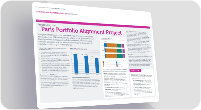 13 Pension Protection Fund Climate Change Report 2022/23 STRATEGY AND RISK MANAGEMENT CONTINUED CASE STUDY Progressing our Work continued throughout this year to refresh our assessments in the Equity, Credit and Real Estate asset Paris Portfolio Alignment Project classes that saw turnover or allocation changes. We can now track how our portfolio alignment has progressed across a number of time periods, and we have already seen Last year we reported on our innovative project to assess the implied good progress. For example, we have seen the percentage temperature rise (ITR) of our portfolio relative to the goals of the 2015 PPF Fund Paris Alignment of the Fund categorised as ‘Not Aligned’ decline by 11 per cent while the percentage classi昀椀ed as ‘Aligned’ increased Paris Agreement. Subsequent analysis has helped us become better +7% -11% by 7 per cent between December 2020 and 2022. informed about our position and how di昀昀erent parts of our portfolio The main driver for the declining allocation to ‘Not Aligned’ might be contributing to climate change. Dec-22 is down to the exponential success of the Science-Based Targets initiative (SBTi), which has nudged many companies up to the ‘Committed to Align’ bucket. In 2020, there were Initiated in early 2021, the Paris Portfolio Alignment ITR for PPF portfolio 2020–2022 918 companies signed up to the SBTi, of which 495 had Project aims to help us: Dec-21 approved targets. By May 2023, this had grown to 5,309 companies. See more in Metrics and Targets. • Understand where – if business were to continue 2.6 as usual – our investment portfolio stands from a 2.5 -8% Strengthening our decarbonisation approach bottom-up perspective in terms of alignment with the 2.4 Dec-20 The Paris Portfolio Alignment Project has enabled us to set Paris Agreement 2.3 a more con昀椀dent direction for decarbonising our portfolio • Develop methodologies for 昀椀lling gaps in asset classes than if we had only set a top-down target – for example – especially among private companies – and try-and- 2.2 0% 10% 20% 30% 40% 50% 60% 70% 80% 90% 100% feeding into the creation of our Climate Watchlist (see test the emerging methodologies 2.1 Net Zero Aligned page 16). It has also allowed us to contribute directly to 2.0 advancing the measurement and management of climate • Assess ITR contributions by all asset classes in order to Committed to Align/Aligning Not Aligned risk using a Paris alignment lens, and identi昀椀ed where identify speci昀椀c companies/assets that are misaligned 1.9 Insufficient data Not included we and our peers need to push for improvements in • Develop engagement strategies for the largest 1.8 alignment data and reporting. contributors to climate change to improve their 1.7 alignment, or consider escalation options, while still How we have categorised our alignment assessments: focusing on meeting our investment objectives. 1.6 Net Zero: Assets already achieving net zero emissions Next steps 1.5 Aligned: Assets with ITR score of 1.5°C or lower; Progress on the PPF ITR score Dec-20 Dec-21 Dec-22 assets with carbon performance aligned with their Each desk within our Investment team has We reported the high-level ITR 昀椀ndings of the 2020 sector Net Zero pathway designated areas of focus for the next year to drive baseline assessment in our 2021/22 report, which showed Categorising assets by alignment further improvement in alignment with the goals of the Fund was on a 2.5°C global warming trajectory. The ITR score is useful in allowing us to aggregate the Committed to align/aligning: Assets with ITR score the Paris Agreement. In summary: di昀昀erent asset classes to give an overall Fund assessment, between 1.5 and 2°C; companies with approved Our December 2022 update indicates the Fund’s ITR but it is more limited in understanding the progress of SBTi target or target set; countries with a Net Zero • For Liquids Markets where data availability score has reduced to 2.3°C (see chart), driven largely alignment. Therefore, we have spent a lot of time further commitment or NDCs ‘almost su昀케cient’ and coverage of ITR/SBTi is greater, action is by improvements in our Equities, Corporate Credit classifying the portfolio (by asset class) into alignment Not aligned: Assets with ITR score over 2°C and no centred around our new Climate Watchlist of and Real Estate books. categories, informed largely by the IIGCC’s Net Zero SBTi target companies requiring targeted engagement on Investment Framework. Insu昀케cient data: Assets that we are unable to model climate transition Not included: Assets or asset classes considered • For Private Markets, the alignment project out-of-scope for the project has emphasised the need for portfolio company disclosure so we can start validating Note: The PPF ESG team’s in-house assessments based on Ortec proxies and replace them with real data. See 2020 and 2021 results, MSCI ITR 2022 analysis, SBTi approved more about how we are progressing this on targets and countries’ targets. Alignment categories are leveraged page 18. from the IIGCC Net Zero Investment Framework.
