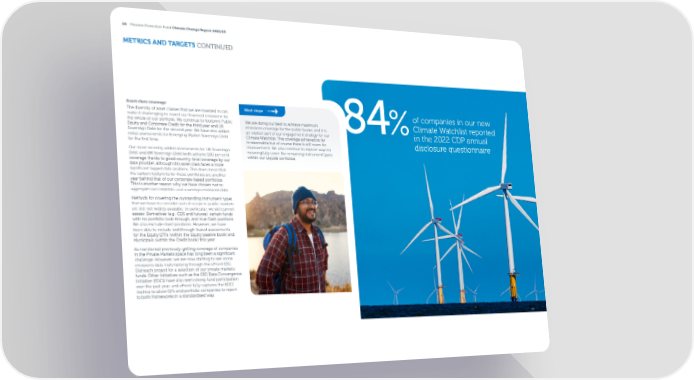 20 Pension Protection Fund Climate Change Report 2022/23 METRICS AND TARGETS CONTINUED Asset class coverage The diversity of asset classes that we are invested in can Next steps of companies in our new make it challenging to report our 昀椀nanced emissions for the whole of our portfolio. We continue to footprint Public We are doing our best to achieve maximum Climate Watchlist reported Equity and Corporate Credit for the third year and UK emissions coverage for the public books, and it is 84% Sovereign Debt for the second year. We have also added an explicit part of our engagement strategy for our in the 2022 CDP annual initial assessments for Emerging Market Sovereign Debt Climate Watchlist. The coverage achieved so far for the 昀椀rst time. is reasonable but of course there is still room for disclosure questionnaire Our more recently added assessments for UK Sovereign improvement. We also continue to explore ways to Debt and EM Sovereign Debt both achieve 100 per cent meaningfully cover the remaining instrument types coverage thanks to good country-level coverage by our within our Liquids portfolios. data provider, although this asset class faces a more signi昀椀cant lagged data problem. This does mean that the carbon footprints for these portfolios are another year behind that of our corporate-based portfolios. This is another reason why we have chosen not to aggregate our corporate and sovereign emissions data. Methods for covering the outstanding instrument types that we have to consider out-of-scope in public markets are still not widely available. In particular, we still cannot assess: Derivatives (e.g., CDS and futures), certain funds with no portfolio look-through, and true Cash positions. We also exclude short positions. However, we have been able to include lookthrough-based assessments for the Equity ETFs (within the Equity passive book) and Municipals (within the Credit book) this year. As mentioned previously, getting coverage of companies in the Private Markets space has long been a signi昀椀cant challenge. However, we are now starting to see some emissions data materialising through the eFront ESG Outreach project for a selection of our private markets funds. Other initiatives such as the ESG Data Convergence Initiative (EDCI) have also seen strong fund participation over the past year, and eFront fully captures the EDCI metrics to allow GPs and portfolio companies to report to both frameworks in a standardised way.