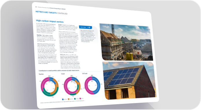 25 Pension Protection Fund Climate Change Report 2022/23 METRICS AND TARGETS CONTINUED High-carbon impact sectors In line with TCFD recommendations, Credit: Overall in our Credit book, we pay particular attention to our high-carbon impact sectors contributed Next steps investment exposure to sectors that more to overall emissions than last year have a higher contribution to global (56 per cent vs 34 per cent in 2021). We continue to engage with carbon emissions. Guided by these companies in these three recommendations, we focus on This is mainly due to an increased sectors – both directly and Utilities, Materials and Energy. contribution by Utilities (17 per cent vs through external managers or 9 per cent), which has seen an increase investor collaborations – to Equities: High-carbon impact both in emissions and asset allocation. encourage a transition to lower- sectors contributed marginally Materials also increased by contribution, carbon activities, especially less to emissions in our Equities with one company contributing to over those companies on our portfolios than last year (67 per cent a third of the sector’s emissions. This Climate Watchlist. vs 73 per cent). company is now part of our Climate Watchlist so will receive enhanced Materials and Utilities decreased attention from us going forward. We their contribution (18 per cent vs have also seen a change in sector 31 per cent, 8 per cent vs 19 per classi昀椀cation for a couple of our cent). However, the contribution credit holdings, for example where from Energy increased substantially the issuance has been re-classi昀椀ed (41 per cent vs 23 per cent). From from Financials to Materials. a risk management perspective, we have identi昀椀ed that 72 per cent UK Credit: Within our UK Credit of the Energy sector emissions are portfolio, the only exposure to high- associated with companies in our carbon impact sectors comes from Climate Watchlist, where targeted Utilities. Despite a slight increase in actions are being incorporated into portfolio allocation to the Utilities our dedicated engagement plans for sector from last year, we have seen a these companies. reduction in the emissions associated with this sector. This is largely due to the companies that we hold reducing their emissions from the previous year. Contribution to overall portfolio carbon emissions by high-impact sectors Equities Credit UK Credit 2022 8% 2022 2022 17% 33% 2021 18% 19% 2021 9% 2021 27% 44% 13% 51% 48% 13% 49% 31% 66% 52% 23% 26% 41% 13% Utilities Materials Energy Other Certain information ©2023 MSCI ESG Research LLC. Reproduced by permission; no further distribution.