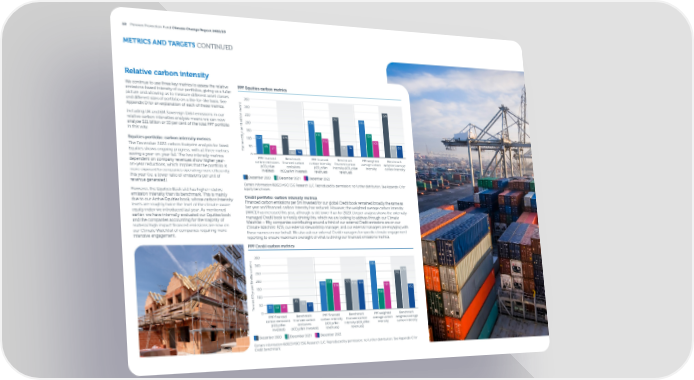 22 Pension Protection Fund Climate Change Report 2022/23 METRICS AND TARGETS CONTINUED Relative carbon intensity We continue to use three key metrics to assess the relative PPF Equities carbon metrics emissions-based intensity of our portfolios, giving us a fuller picture and allowing us to measure di昀昀erent asset classes 350 and di昀昀erent sizes of portfolio on a like-for-like basis. See c i Appendix D for an explanation of each of these metrics. r 300 et 299 m n 250 Including UK and EM Sovereign Debt emissions in our o 257 243 relative carbon intensities analysis means we can now illi 226 m 200 $ analyse $21 billion or 55 per cent of the total PPF portfolio r pe150 in this way. 154 e2 151 O 122 125 C 100 Equities portfolio: carbon intensity metrics 112 108 es 83 83 n 70 74 The December 2022 carbon footprint analysis for listed n 50 65 57 o Equities shows ongoing progress, with all three metrics T 30 34 seeing a year-on-year fall. The two intensity metrics 0 PPF financed Benchmark PPF financed Benchmark PPF weighted Benchmark dependent on company revenues show higher year- carbon emissions financed carbon carbon intensity financed carbon average carbon weighted average on-year reductions, which implies that the portfolio is (tCO e/$m emissions (tCO e/$m intensity (tCO e/$m intensity carbon intensity 2 2 2 invested) (tCO e/$m invested) revenues) revenues) more exposed to companies operating more e昀케ciently 2 this year (i.e. a lower ratio of emissions per unit of December 2020 December 2021 December 2022 revenue generated). Certain information ©2023 MSCI ESG Research LLC. Reproduced by permission; no further distribution. See Appendix C for However, the Equities Book still has higher relative Equity benchmark. emission intensity than its benchmark. This is mainly Credit portfolio: carbon intensity metrics due to our Active Equities book, whose carbon intensity Financed carbon emissions per $m invested for our global Credit book remained broadly the same as levels are roughly twice the level of the climate-aware last year and 昀椀nanced carbon intensity has reduced. However, the weighted average carbon intensity equity index we introduced last year. As mentioned (WACI) has increased this year, although is still lower than for 2020. Deeper analysis shows the externally- earlier, we have internally evaluated our Equities book managed Credit book is mostly driving this, which we are looking to address through our Climate and the companies accounting for the majority of Watchlist – 昀椀fty companies contributing around a third of our external Credit emissions are on our material high impact 昀椀nanced emissions are now on Climate Watchlist. EOS, our external stewardship manager, and our external managers are engaging with our Climate Watchlist of companies requiring more these names on our behalf. We also ask our external Credit managers for speci昀椀c climate engagement intensive engagement. reporting to ensure maximum oversight of what is driving our 昀椀nanced emissions metrics. PPF Credit carbon metrics c 350 i r 300 318 et m 279 n 250 o 255 illi m 200 $ 204 203 r 192 179 193 194 181 pe150 162 e2 133 O C 100 es 85 n 50 70 n 53 51 57 o 50 T 0 Benchmark Benchmark PPF weighted Benchmark PPF financed PPF financed carbon emissions carbon intensity average carbon weighted average financed carbon financed carbon (tCO e/$m emissions (tCO e/$m intensity (tCO e/$m intensity carbon intensity 2 2 2 invested) (tCO e/$m invested) revenues) revenues) 2 December 2020 December 2021 December 2022 Certain information ©2023 MSCI ESG Research LLC. Reproduced by permission; no further distribution. See Appendix C for Credit benchmark.