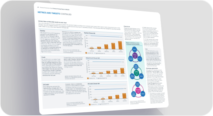 27 Pension Protection Fund Climate Change Report 2022/23 METRICS AND TARGETS CONTINUED 1 Climate Value-at-Risk 2022 results by asset class Physical risk In Credit, Physical VaR is primarily The 1.5°C Disorderly scenario continues to present the greatest CVaR for all three of our analysed asset classes. Note: Due to model enhancements by our data Physical risk within Equities is driven accounted for by Extreme Heat provider, the 1.5°C Orderly scenario now presents a worse outcome than the 2°C Disorderly scenario. This is because MSCI has changed the way they calculate mostly by Extreme Heat (17 per cent (7 per cent of the 12 per cent). In terms costs, which is one of the main inputs for Climate VaR. of the 25 per cent of Physical VaR). of sector, Food & Staples Retailing, This is mainly due to Banks – the most Transportation and Utilities have the exposed sector – then Energy and highest exposure; and in terms of Equities We hope our actions to assess and Equities Climate VaR Telecommunications Services. China, regional exposure, the US and China The impact from a 1.5°C Disorderly manage all our assets’ alignment with US, and Japan are the most exposed have the highest exposure. scenario is most signi昀椀cant for Paris targets (see page 13) will further k 25% 25.1% regions to physical risk within the In UK Credit, physical risk is mostly s help to improve this resilience in the i Equities, with a Transition VaR of r Equities book. 20% coming from Coastal Flooding (15 future. For example, Energy is the most at over 16 per cent. The Physical VaR e per cent of the 19 per cent). Capital u for the aggressive physical risks exposed sector within Equities under l 15% 16.5% a Biggest contributing sectors Goods is the most exposed sector; v Transition VaR. As mentioned, 72 per scenario is 25 per cent. Whilst the e 12.5% to physical risks by portfolio Netherlands and United Kingdom Transition VaR is lower than last year cent of the Energy sector emissions at10% m are the most exposed countries. are associated with companies in our li 9.1% (which was 38 per cent), it suggests c l 5% a our Equities portfolio is still not Climate Watchlist. t o 1.7% 3.8% very resilient to scenarios factoring T 0 Banks Note in delayed but forceful action to 3ºC 2ºC 2ºC 1.5ºC 1.5ºC The UK Credit book has some keep global warming within Paris Certain information ©2023 MSCI ESG hot house orderly disorderly orderly disorderly physical risk exposure to other Agreement levels. Research LLC. Reproduced by permission; countries besides the UK. This no further distribution. Transition risk Aggressive physical risk Equities: is because it includes non-UK Ph VaR companies that issue Sterling debt 25% or companies that might have Credit Transportation is the most exposed Global Credit Climate VaR Telecoms Energy assets located elsewhere than UK. sector under Transition VaR across Services For another year, our global Credit 12% If MSCI does not have data for the portfolios registered a lower CVaR, all 昀椀ve scenarios. This is due to k 11.1% underlying credit issuer, we may s the sector being highly exposed to i than our Equities ranging from 12 to r 10% use data from the ultimate parent transition risks around electri昀椀cation at 16 per cent under our 昀椀ve scenarios to approximate the risk, which e 8% u Food & when aggregating both Transition and a move away from fossil fuel l may not be a UK name. a v Staples energy sources. 6% and Physical VaR. Whilst the Physical e Retailing VaR is higher than last year, due to the at 5.2% Technology opportunities m 4% li methodology changes undertaken c Although a 1.5°C Disorderly scenario l 3.4% a by MSCI, the Transition VaR is lower t 2% 2.6% Credit is expected to have the highest – and o 0.8% for both 2°C and 1.5°C disorderly T 0 1.1% Ph VaR hence worst – Climate VaR for all asset scenarios than last year. 3ºC 2ºC 2ºC 1.5ºC 1.5ºC 11% classes we analyse, it is also expected Certain information ©2023 MSCI ESG hot house orderly disorderly orderly disorderly Trans- Utilities to generate the most exposure of all Research LLC. Reproduced by permission; portation scenarios to Technology Opportunities. no further distribution. Transition risk Aggressive physical risk Technology, Buildings and Health have the highest future low-carbon UK Credit However, there is considerable UK Credit Climate VaR technology potential. MSCI’s Even taking into account the exposure in this portfolio to Utilities Capital modelling suggests that the sector methodology changes year-on- companies that have set science- 25% Goods best positioned for low carbon k opportunities is Heavy Manufacturing s based targets. Our expectation is that i year, we have seen Transition VaR r 20% 19.1% in the Equities portfolio, Technology if these companies start delivering on at increase for the UK Credit book. This e UK Credit and semiconductors manufacturing u is likely to be driven by the increased their goals, then the transition risk they l 15% a in the Credit portfolio and Rail and v Ph VaR are exposed to will decline. exposure to Utilities. e 19% Utilities in the UK Credit portfolio. at10% Food & m 10.1% li Staples Utilities 1 The Climate VaR of a company, in any given c l 5% 7.4% Retailing scenario, is simply the present value of the a t 1.6% 5.2% o costs impacts in that scenario divided by T 0 0.8% the current enterprise market value of the 3ºC 2ºC 2ºC 1.5ºC 1.5ºC company. The enterprise market value is Certain information ©2023 MSCI ESG hot house orderly disorderly orderly disorderly computed as the sum of the market values Research LLC. Reproduced by permission; Certain information ©2023 MSCI ESG of a company’s equity and debt. The book no further distribution. Transition risk Aggressive physical risk Research LLC. Reproduced by permission; value of debt is used to proxy the market no further distribution. value of debt at the company level.