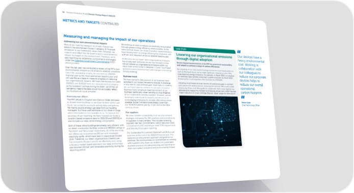 34 Pension Protection Fund Climate Change Report 2022/23 METRICS AND TARGETS CONTINUED Measuring and managing the impact of our operations Addressing our own environmental impacts We continue to work to reduce our electricity consumption CASE STUDY Most of our material exposure to climate-related risks through greater energy e昀케ciency where possible. As the exists in the downstream Scope 3 category 15 ‘昀椀nanced table overleaf shows, our Scope 2 location-based emissions Our devices have a emissions’ in our investment value chain. However, we have steadily fallen as energy e昀케ciency has improved, with Lowering our organisational emissions support and re昀氀ect the UK Government’s commitment to a 34 per cent reduction since our 2019/20 baseline year. through digital adoption heavy environmental reduce its impact on the environment. Therefore, we’re As Net Zero for our ‘easier’ direct organisational emissions cost. Working in also reporting our ambitions, commitments and targets has already been achieved, we are now focused on how Recent digital transformation at the PPF has prioritised sustainability under the Greening Government Commitments (GGC) we can reduce our organisational emissions within our and helped us achieve a range of carbon e昀케ciencies. collaboration with where possible. value chain across Scope 3 categories 1, 6 and 7 (purchased goods & services, business travel and employee commuting/ By migrating all our data and technology services to cloud-based platforms our colleagues to Over the last year, we conducted a review of the PPF’s own such as Microsoft Azure, we’ve made signi昀椀cant reductions in the PPF’s environmental impacts as a business to establish a baseline. remote working). organisational energy emissions. For example, in March 2022, our physical reduce our corporate Given the availability of data, we selected our 2019/20 Business travel on-premises data centres consumed 7,111kWh of power. By March 2023, 昀椀nancial year as the most appropriate baseline year and following the cloud migration, this had fallen to 2,951kWh. devices helps to will use this as a basis to measure progress on reducing We have started to take account of our business travel our organisational impacts. We have intentionally excluded activities in our Scope 3 emissions analysis. A challenge Adopting cloud-based services has also allowed employees to use their reduce our overall 2020/21 and 2021/22 from our measurement of progress is how best to capture employees’ travel data, so currently, own phones for work purposes, reducing the need for PPF-issued mobile operational as the lockdown periods during the 2020–22 COVID-19 we use travel expense invoices to calculate emissions. phones by 72 per cent. Being able to collaborate more easily digitally has pandemic means the data would not accurately re昀氀ect Business travel remains an essential element of our allowed us to reduce the number of printers by 33 per cent, which has also carbon footprint. our business-as-usual activities. business, particularly when carrying out due diligence meant reduction in toner cartridge disposal, paper usage and site support. of our investments and key suppliers. However, we are Assessing our o昀케ces working to understand its impacts and will focus on The PPF o昀케ces in Croydon and Cannon Street are based encouraging employees to consider alternatives where Simon Liste in shared-lease buildings so we have limited control over possible. Scope 3 emissions are already lower than them, nor complete access to activity data and systems. our 2019/20 baseline year by 12 per cent as the table, Chief Technology O昀케cer We mainly source energy-use data from our building overleaf, shows. managers, but have used estimates of our share of usage Our suppliers when information is not available to us. To improve the accuracy of our reporting, we have restated our Scope 2 We now consider sustainability in all our procurement location-based emissions data for 2021/22 and 2020/21 to strategies and assess the ESG practices and commitments also include our data centre energy consumption. of suppliers in many tenders. This includes reviewing suppliers’ Net Zero commitments, carbon reduction plans, Both of these o昀케ce buildings are already very e昀케cient, with commitment to ESG reporting to meet TCFD requirements, no direct combustion facilities onsite and BREEAM ratings of and Diversity & Inclusion reporting. ‘Excellent’ and ‘Very Good’ respectively. All of the electricity our o昀케ces use is sourced via 100 per cent renewable Our Sustainable Procurement Statement and Policy was electricity tari昀昀s, which have been in place since October approved at the end of the 2022/23 昀椀nancial year. This 2019. Therefore, our direct organisational Greenhouse captures our procurement approach and governs our Gas emissions (Scope 1 and 2) are e昀昀ectively zero using practices. We communicate our commitment to working a Scope 2 market-based approach. Our data centres have with suppliers who share our ambition for sustainable also sourced 100 per cent renewable electricity during the business practices including reducing and reporting on reporting period. their own carbon emissions and environmental impact.