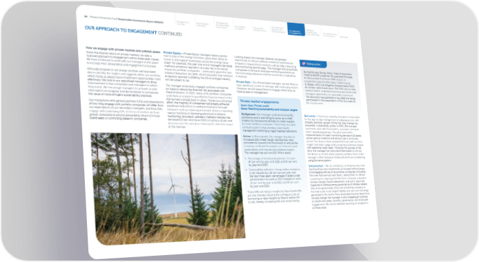 Strengthening Our investment Escalation Message from Key highlights our stewardship Our progress Our purpose approach and Our approach and exercising Our aspirations for 26 Pension Protection Fund Responsible Investment Report 2022/23 our Chair of the year commitment at a glance and governance incorporating ESG to engagement shareholder rights the coming year Appendices OUR APPROACH TO ENGAGEMENT CONTINUED How we engage with private markets and unlisted assets Private Equity – Private Equity managers have a central Looking ahead, the manager believes the greatest Given the diverse nature of private markets, we take a role to play in the energy transition, given their ability to opportunity to reduce methane emissions (and improve Taking action nuanced approach to engagement within these asset classes. invest in and support businesses across the energy value emissions measurement) involves cutting-edge measuring We have continued to work with our managers in this space chain. For example, this year one of our managers identi昀椀ed and monitoring technologies. The manager and its portfolio During the year, Sanjay Mistry, Head of Alternative to increase their stewardship and engagement processes. methane emissions regulation as a key risk to its natural companies continue to evaluate monitoring solutions as Credit at the PPF, joined the UN-supported Principles resources portfolio companies – particularly given the new the technology advances and the economics of adopting for Responsible Investment (PRI) project, in Although progress is not always positive, we have been In昀氀ation Reduction Act (IRA), which stipulates that methane it improve. conjunction with the Alternative Credit Council, able to identify the leaders and laggards within our portfolio, emissions reported in 2024 by the US oil and gas industry to design a ESG Due Diligence Questionnaire (DDQ) which helps us assess future investment opportunities more will be subject to tax. Private Debt – Our Private Debt managers are less likely to e昀昀ectively. We look to our appointed managers to drive have signi昀椀cant control or leverage with underlying issuers. for private credit investments. This DDQ aims to help improvement in the companies and managers in which The manager proactively engaged portfolio companies However, we still expect them to engage where they do investors better understand and evaluate private debt they invest. We encourage managers to provide us with on ways to reduce the 昀椀nancial risk associated with have access to management. managers’ approaches to responsible investment. information on progress and demonstrate to companies these emissions. In 2022, many of its portfolio companies The document was published in July 2023 and Sanjay the value of more stringent sustainability practices. undertook an analysis to quantify the 昀椀nancial impact of the participated in the presentation of the document at IRA tax had it already been in place. Thanks to a concerted Private market engagements the launch event. Our interactions with general partners (GPs) and expectations e昀昀ort, the majority of companies had already achieved Asset class: Private credit of how they engage with portfolio companies will di昀昀er from signi昀椀cant reductions in methane emissions through Issue: Reaching sustainability and inclusion targets our expectations of our secondary managers, and how they measures such as replacing pneumatic devices, improving engage with underlying GPs. In terms of control, we have vapour recovery or deploying advanced emissions Background: One manager is demonstrating ESG Real estate – One of our property managers is responsible greater expectations around stewardship where GPs hold monitoring. As a result, upstream methane intensity has excellence and is exercising its power as a credit for the day-to-day management of a European (inc. UK) board seats or controlling stakes in companies. decreased 67 per cent since 2020, including a 46 per cent investor by introducing ratchets on credit margins property portfolio. As part of this role, they oversee the decrease over the past year, reducing the potential impact to some portfolio companies. These have included properties’ sustainability pro昀椀le. In 2021, the manager of the new tax. a 昀椀ntech platform that provides retail wealth launched a pilot with Smartvatten, a provider of remote management platforms to major 昀椀nancial institutions. water-monitoring devices. The pilot covered the Action: In this example, the manager was able to implementation of water-monitoring devices in 10 assets introduce ESG-linked margin ratchets that were across various locations and sectors over a 12-month symmetrical (upward and downward) to ensure the period. The devices have provided the fund with real-time company continued its progress on more inclusive insight into water usage at the properties and have helped sustainability and maintained ambitious targets. with detecting water leaks. Following the success of the The manager has put two ESG KPIs in place: pilot, the manager has instructed Smartvatten to roll out the device across the whole property portfolio. Some of the • Percentage of female professionals: To reach manager’s other European funds and clients are considering 47 per cent by year-end 2022 and 50 per cent using the same system. by year-end 2023. Infrastructure – We are invested in an Infrastructure fund • Sustainability indicators: Group carbon emissions that has three core investments all focused within Europe. to be reduced by c.10 per cent per year over It is engaging with all of its portfolio companies (including the next three years; percentage of assets under the ones that we hold with them), asking them to: devise administration focused on ESG strategies to reach a roadmap for aligning with Net Zero; complete a detailed 32 per cent by year-end 2022 and 56 per cent climate change impact assessment; and pu