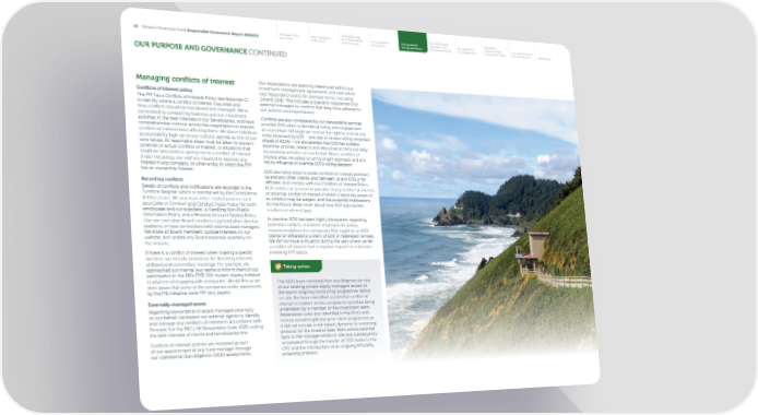 Strengthening Our investment Escalation Message from Key highlights our stewardship Our progress Our purpose approach and Our approach and exercising Our aspirations for 15 Pension Protection Fund Responsible Investment Report 2022/23 our Chair of the year commitment at a glance and governance incorporating ESG to engagement shareholder rights the coming year Appendices OUR PURPOSE AND GOVERNANCE CONTINUED Managing con昀氀icts of interest Our expectations are explicitly referenced within our investment management agreements and side letters Con昀氀icts of Interest policy (see Appendix D and G for example terms, including The PPF has a Con昀氀icts of Interests Policy (see Appendix C) 1.4 and 1.8.4). This includes a quarterly requirement for to identify where a con昀氀ict of interest may arise and external managers to con昀椀rm that they have adhered to how con昀氀icts should be monitored and managed. We’re our policies and expectations. committed to conducting business and our investment Con昀氀icts are also considered by our stewardship services activities in the best interests of our bene昀椀ciaries, and have provider EOS when undertaking voting and engagement comprehensive controls across the organisation to prevent on our behalf. Although we reserve the right to amend any con昀氀icts of interest from a昀昀ecting them. We place individual votes proposed by EOS – and also to review voting proposals accountability high up on our cultural agenda as one of our ahead of AGMs – we are satis昀椀ed that EOS has suitable core values. All reasonable steps must be taken to prevent expertise, policies, research and resources to carry out daily potential or actual con昀氀icts of interest, or situations that stewardship activities on our behalf. Where con昀氀icts of might be perceived as giving rise to a con昀氀ict of interest. interest arise, we adopt an arm’s length approach and aim Under the policy, our sta昀昀 are required to disclose any not to in昀氀uence or override EOS’s voting decision. interest in any company, or other entity, in which the PPF has an ownership interest. EOS also takes steps to avoid con昀氀icts of interest between us and any other clients, and between us and EOS or its Recording con昀氀icts a昀케liates, and comply with our Con昀氀icts of Interest Policy. Details of con昀氀icts and noti昀椀cations are recorded in the EOS noti昀椀es us as soon as possible of any con昀氀ict of interest, Con昀氀icts Register which is maintained by the Compliance or potential con昀氀ict of interest of which it becomes aware or & Ethics team. We also have other related policies such to which it may be subject, and the potential implications as a Code of Conduct and Conduct Rules Policy (for both for the Board. Read more about how EOS approaches employees and our suppliers), a Handling Non-Public con昀氀icts of interest here. Information Policy, and a Personal Account Dealing Policy. In practice, EOS has been highly transparent regarding Our non-executive Board members may hold other director potential con昀氀icts of interest relating to its voting positions, or have connections with external asset managers. recommendations for companies that might be an EOS We share all Board members’ outside interests on our clients (or a昀케liated to a client of EOS or Federated Hermes). website, and update any Board expenses quarterly on We did not have a situation during the year where we felt the website. a con昀氀ict of interest had a negative impact on a decision If there is a con昀氀ict of interest when making a speci昀椀c involving PPF assets. decision, we include provisions for declaring interests at Board and committee meetings. For example, we Taking action approached our internal levy teams to inform them of our participation in the PRI’s FTSE 350 modern slavery initiative in advance of engaging with companies. We did this as we The ODD team refreshed their due diligence for one were aware that some of the companies under assessment of our existing private equity managers as part of by the PRI initiative were PPF levy payers. the team’s ongoing monitoring programme. Whilst on-site, the team identi昀椀ed a potential con昀氀ict of Externally-managed assets interest in relation to the compliance activities being Regarding stewardship of assets managed externally undertaken by a member of the investment team. on our behalf, we expect our external agents to identify Weaknesses were also identi昀椀ed in the 昀椀rm’s anti- and manage any con昀氀icts of interest in accordance with money laundering/know your client programme as Principle 3 of the FRC’s UK Stewardship Code 2020, putting it did not include a risk-based, dynamic re-screening the best interests of clients and bene昀椀ciaries 昀椀rst. protocol for the investor base. Both points were fed back to the manager while on-site and subsequently Con昀氀icts of interest policies are reviewed as part remediated through the transfer of CCO duties to the of our appointment of any fund manager through CFO and the introduction of an ongoing KYC/AML our operational due diligence (ODD) assessments. screening protocol.