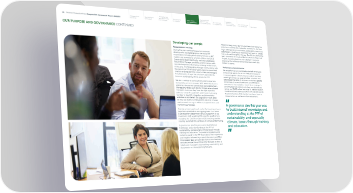 Strengthening Our investment Escalation Message from Key highlights our stewardship Our progress Our purpose approach and Our approach and exercising Our aspirations for 12 Pension Protection Fund Responsible Investment Report 2022/23 our Chair of the year commitment at a glance and governance incorporating ESG to engagement shareholder rights the coming year Appendices OUR PURPOSE AND GOVERNANCE CONTINUED Developing our people A Board strategy away-day included deep-dive interactive workshops covering ESG materiality assessments, Net Zero Resources and training target-setting and communicating sustainability issues to all During the year, we have focused on continual stakeholders. Upskilling of the Investment team on climate development and training across the entire PPF has continued throughout the year. The ESG & Sustainability organisation, including the Investment team on ESG team presented the results of the Paris Portfolio Alignment matters and stewardship activities. Within the ESG & Project, including baseline and subsequent progress. Sustainability team speci昀椀cally, we hired a dedicated Executive Committee and Board members were also Stewardship Manager, providing a senior person with invited to attend. specialist experience to lead our strategy and activities Performance incentivisation in this area. The Stewardship Manager works closely with the rest of the ESG & Sustainability team to ensure best We set performance incentivisation for both employees practice and that learning opportunities are leveraged. and external agents. For all our sta昀昀, performance is A Sustainability Analyst has also been appointed to measured against a balanced scorecard of objectives focus on sustainability e昀昀orts across the PPF. covering business-as-usual activities, initiatives, and behaviours, the latter of which accounts for a speci昀椀c We also continue to work with an external specialist percentage of an employee’s annual performance stewardship services provider, EOS, which has its own assessment. This includes a review of an employee’s extensive, diverse and experienced stewardship team. performance with reference to their core behaviours We regularly review EOS and our chosen external asset across our ICARE values (see page 8). We also have an managers to ensure they have the right expertise, investment directorate balanced scorecard with speci昀椀c policies, research capabilities and resources to carry RI and stewardship KPIs that the Investment team is out day-to-day ESG integration and stewardship measured on, as well as a culture assessment. activities on our behalf. See page 20 for more detail on how we assess our stewardship services provider and our asset managers within our appointment and monitoring processes. A governance aim this year was Training sessions and teach-ins for the Investment team to build internal knowledge and have been provided on an ongoing basis. Our Talent & Development department is fully supportive of our understanding at the PPF of investment sta昀昀 acquiring ESG-speci昀椀c quali昀椀cations, sustainability, and especially including the CFA Certi昀椀cate in ESG Investing and the recently-launched CFA Certi昀椀cate in Climate and Investing. climate, issues through training A governance aim this year was to build internal and education. knowledge and understanding at the PPF of sustainability, and especially climate issues through training and education. Two external speakers were invited to speak to the PPF Board about their experience and insights, followed by a panel discussion and Q&A. One speaker gave an overview from a non-昀椀nancial services perspective and the other focused on how a listed asset manager is approaching sustainability and its commitment to supporting Net Zero.