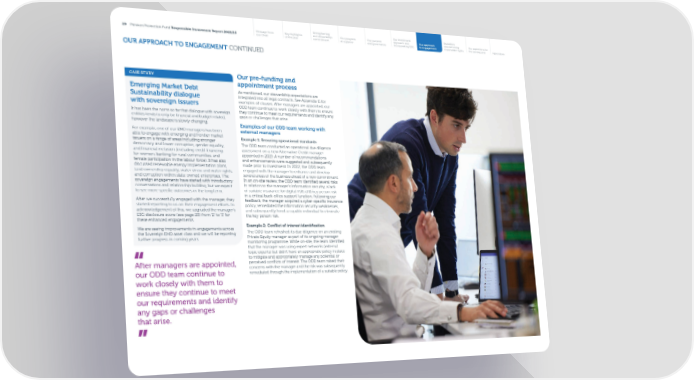 Strengthening Our investment Escalation Message from Key highlights our stewardship Our progress Our purpose approach and Our approach and exercising Our aspirations for 29 Pension Protection Fund Responsible Investment Report 2022/23 our Chair of the year commitment at a glance and governance incorporating ESG to engagement shareholder rights the coming year Appendices OUR APPROACH TO ENGAGEMENT CONTINUED CASE STUDY Our pre-funding and Emerging Market Debt appointment process As mentioned, our stewardship expectations are Sustainability dialogue integrated into all legal contracts. See Appendix G for with sovereign issuers examples of clauses. After managers are appointed, our ODD team continue to work closely with them to ensure It has been the norm so far that dialogue with sovereign they continue to meet our requirements and identify any entities tends to only be 昀椀nancial and budget related, gaps or challenges that arise. however the landscape is slowly changing. Examples of our ODD team working with For example, one of our EMD managers has been external managers able to engage with emerging and frontier market Example 1: Ensuring operational standards issuers on a range of areas including stronger democracy and lower corruption, gender equality, The ODD team conducted an operational due diligence and 昀椀nancial inclusion (including credit 昀椀nancing assessment on a new Alternative Credit manager for women, banking for rural communities, and appointed in 2019. A number of recommendations female participation in the labour force). It has also and enhancements were suggested and subsequently discussed renewable energy implementation plans, made prior to investment. In 2022, the ODD team land ownership equality, water stress and water rights, engaged with the manager to enhance and develop and corruption within state-owned enterprises. The several areas of the business ahead of a new commitment. sovereign engagements have started with introductory In an on-site review, the ODD team identi昀椀ed several risks conversations and relationship building, but we expect in relation to the manager’s information security, a lack to see more speci昀椀c outcomes in the long term. of suitable insurance for digital risks and key person risk in a critical back-o昀케ce support function. Following our After we successfully engaged with the manager, they feedback, the manager acquired a cyber-speci昀椀c insurance started reporting to us on their engagement e昀昀orts. In policy, remediated the information security weaknesses, acknowledgement of this, we upgraded the manager’s and subsequently hired a capable individual to eliminate ESG disclosure score (see page 20) from ‘2’ to ‘3’ for the key person risk. these enhanced engagements. We are seeing improvements in engagements across Example 2: Con昀氀ict of interest identi昀椀cation the Sovereign EMD asset class and we will be reporting The ODD team refreshed its due diligence on an existing further progress in coming years. Private Equity manager as part of its ongoing manager monitoring programme. While on-site, the team identi昀椀ed that the manager was using expert networks (external topic experts) but didn’t have an appropriate policy in place to mitigate and appropriately manage any potential or After managers are appointed, perceived con昀氀icts of interest. The ODD team raised their concerns with the manager and the risk was subsequently our ODD team continue to remediated through the implementation of a suitable policy. work closely with them to ensure they continue to meet our requirements and identify any gaps or challenges that arise.